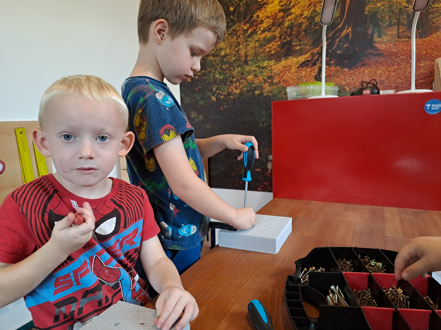 8.10. Dnes jsme se s dětmi seznámili s dílnou. Jak se s jakým nářadím pracuje a jaká máme v dílně pravidla, abychom si neublížily. Aby jsme si jen nepovídaly, děti si to i vyzkoušely. Nacvičovaly jsme zatloukání a hlavně šroubování vrutů do tvrzeného polystyrénu. Děti si to vyzkoušely i do dřeva, aby zjistily, že musí i zatlačit. Každy si vytvořil obrázek.