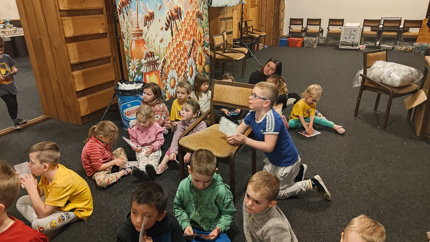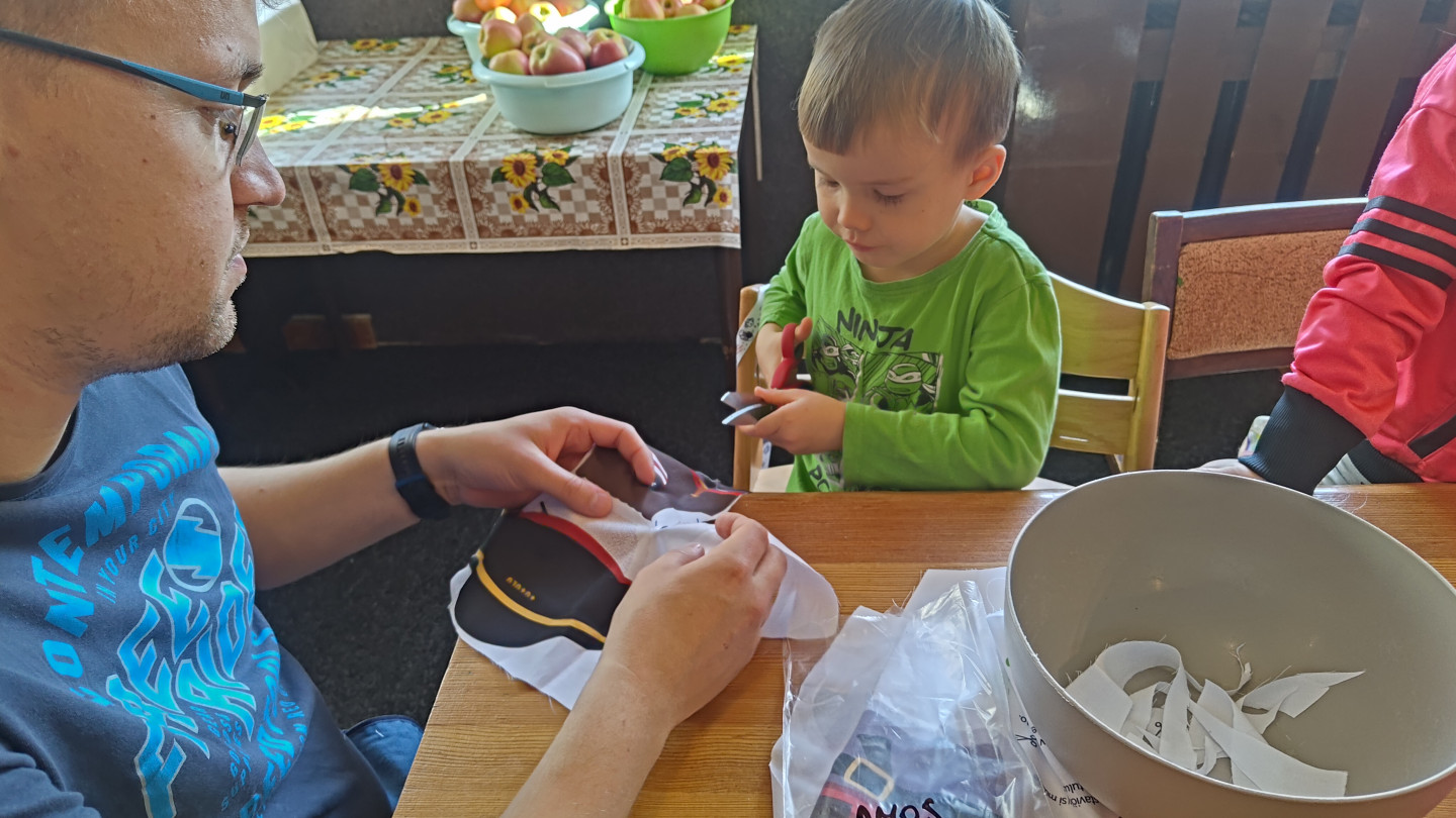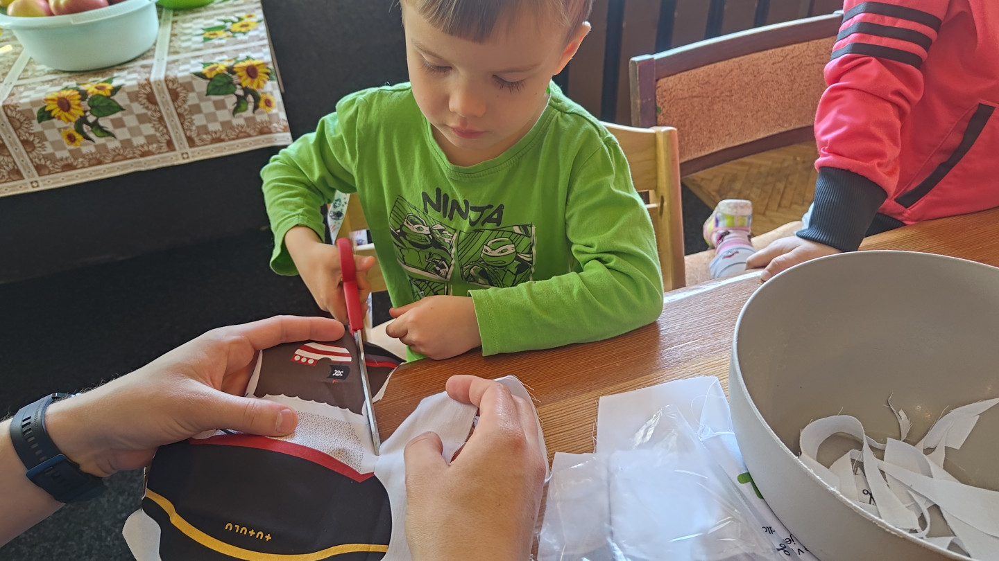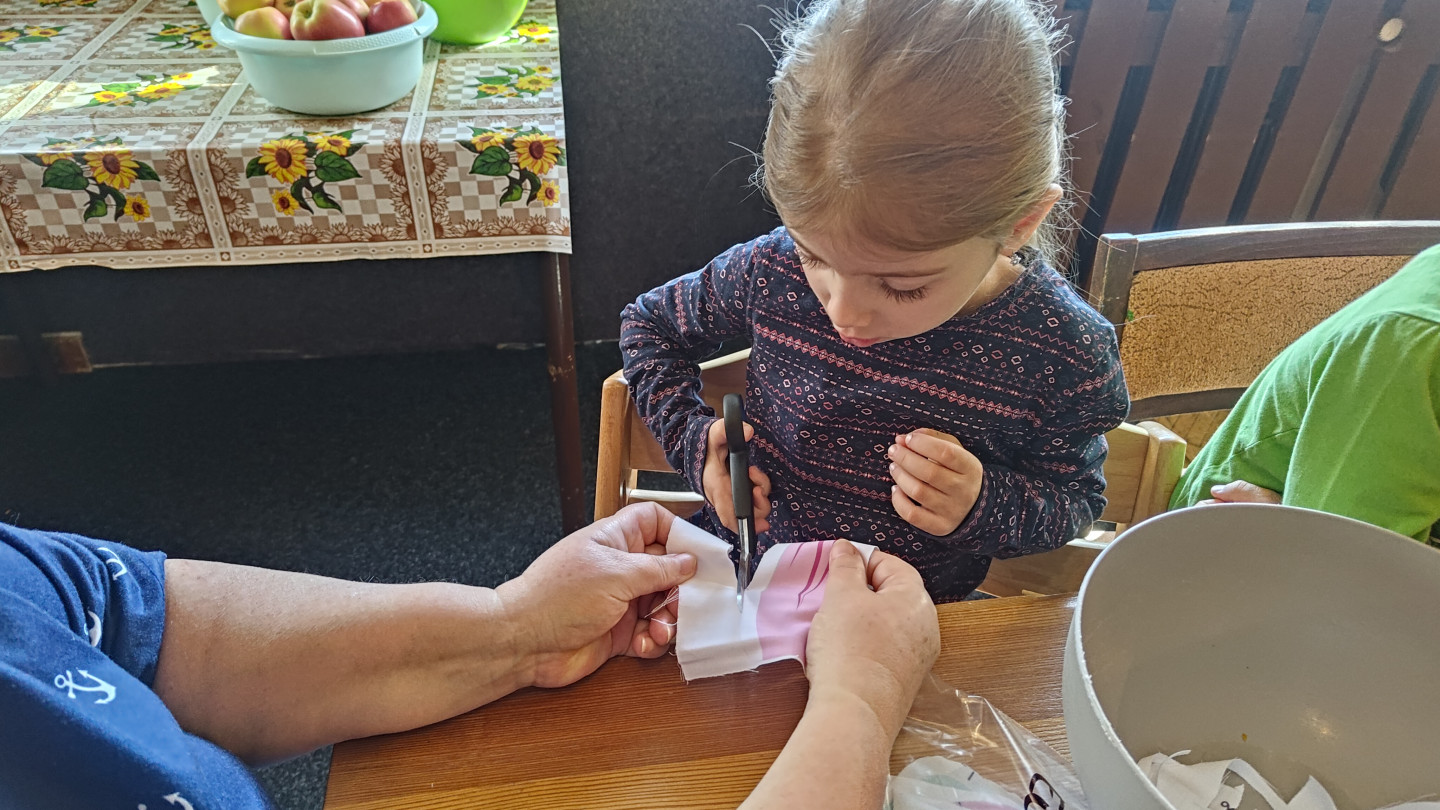 Dopoledne si někteří stříhali látku na látkové postavičky, jiní si hráli v herně.