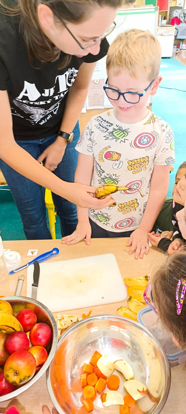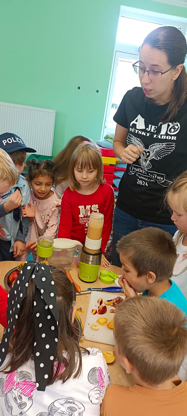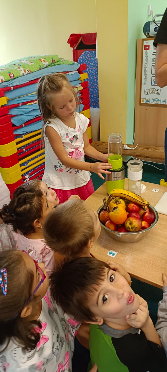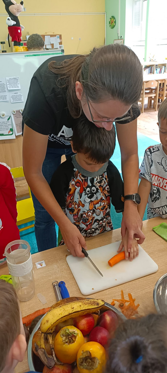 Ve třídě Včeliček si povídáme o ovoci a zelenině. Společně jsme si povídali a hlavně jsme společně ochutnali ovoce a zeleninu (jablko,nektarinka,banán,mrkev,řepa...) S pomocí paní učitelky děti zeleninu a ovoce nakrájely a oškrabaly. Nakrájené kostky jsme buď snědli nebo jsme z nich udělaly smoothi podle přání děti. Většina dětí ochutnala a chutnalo jim.