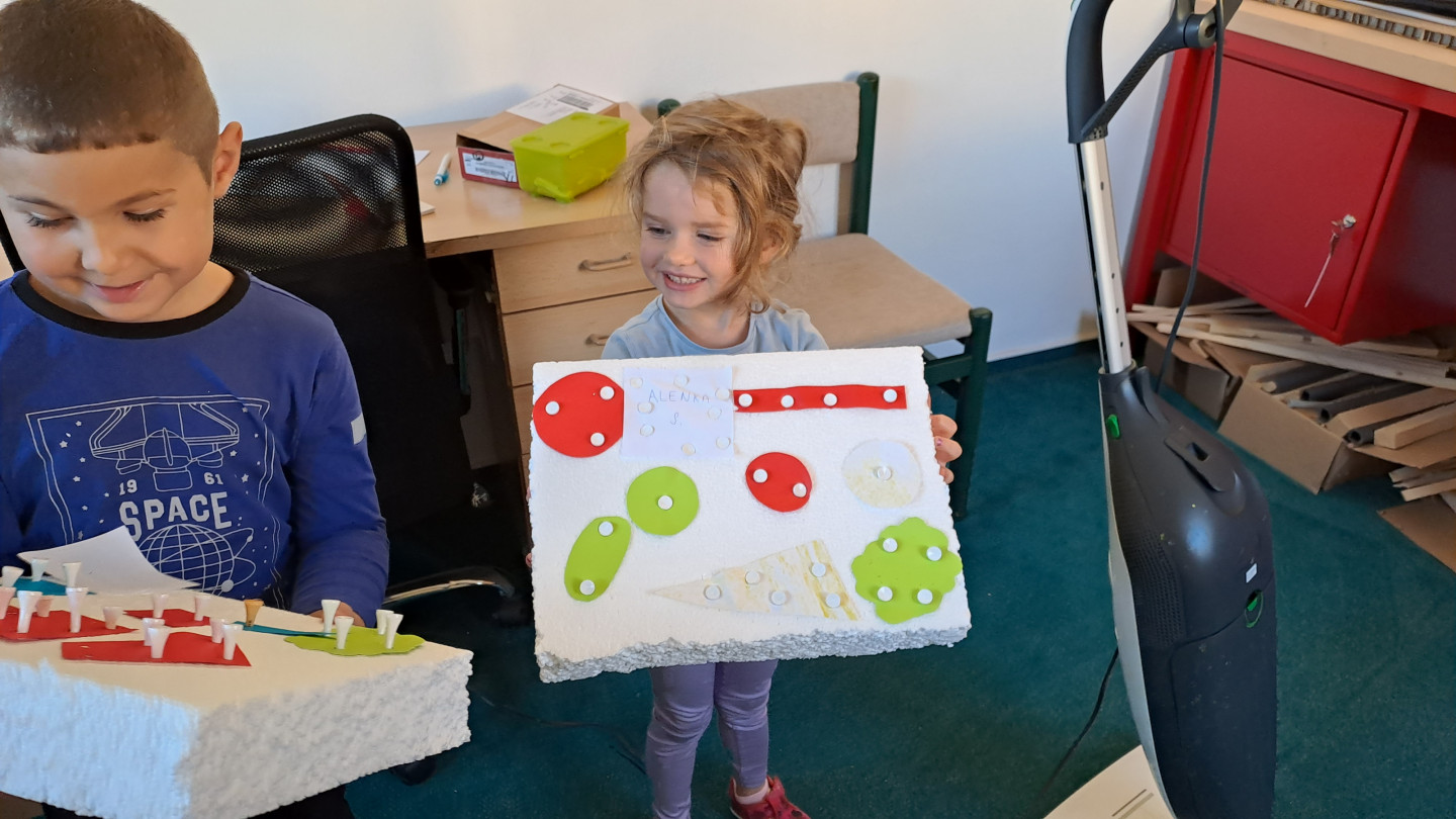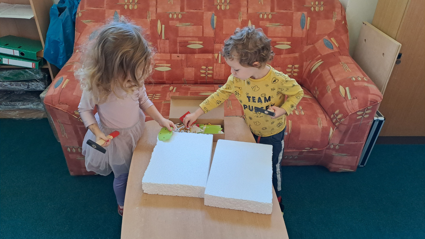 Děti se seznámily s nářadím ve školní dílně, seznámily jsme se s pravidly a naučily jsme se zatloukat hřebíky. Po práci jsme si pracoviště a nářadí uklidily.