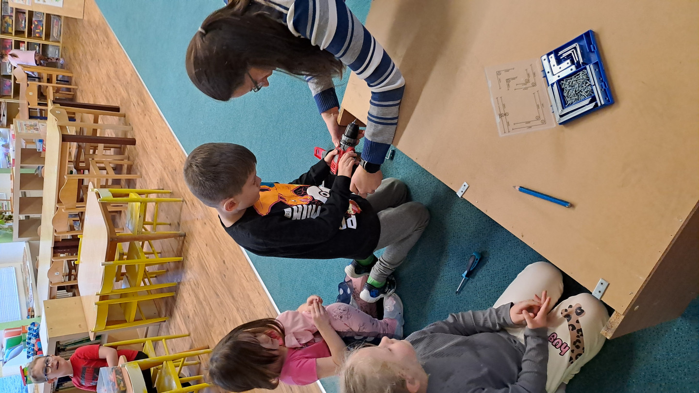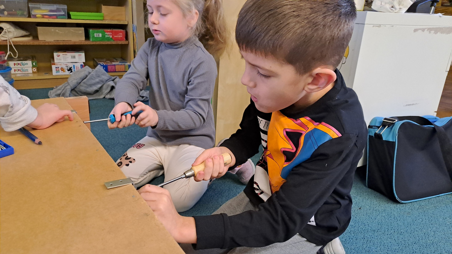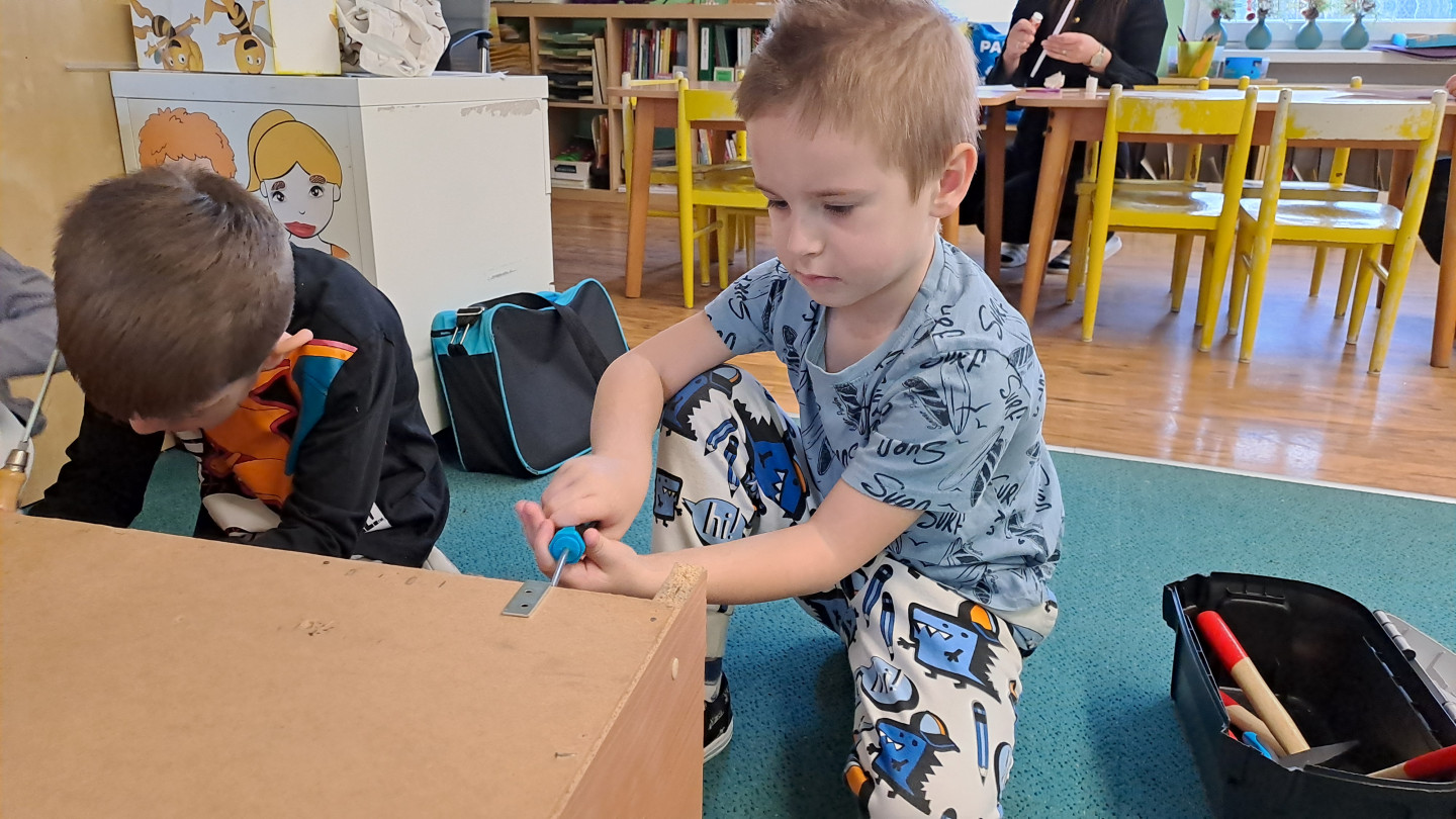 Kroužek Malý kutil se pustil do opravy skříně a stolu ve školce. Některé děti i mimo kroužek se zapojily a vyzkoušely si třeba zatloukání nebo šroubování.