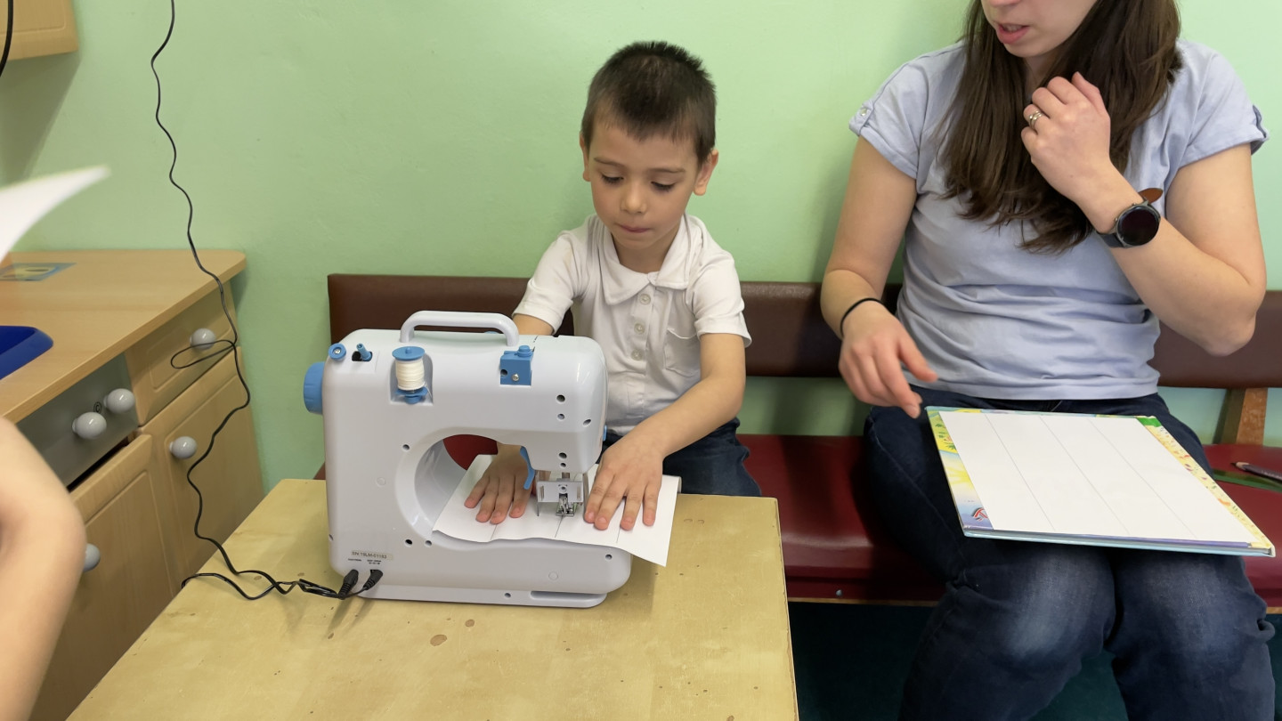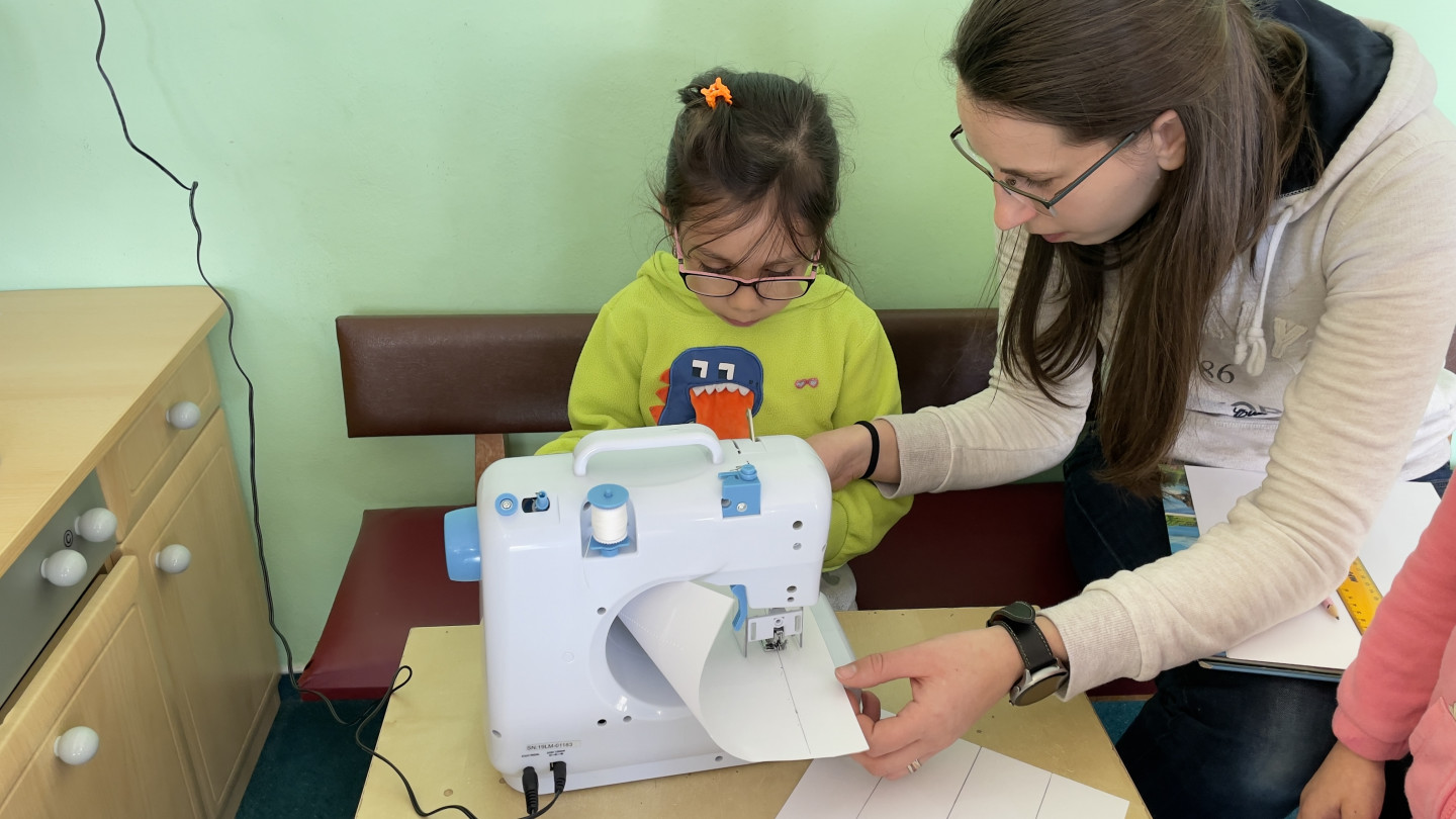 Šicí stroj je určený pro děti a je opatřen chráničem, aby si děti nepřišily prsty. Taky se seznamily s pilkou. Byly poučeny jak s pilkou mají správně zachazet.