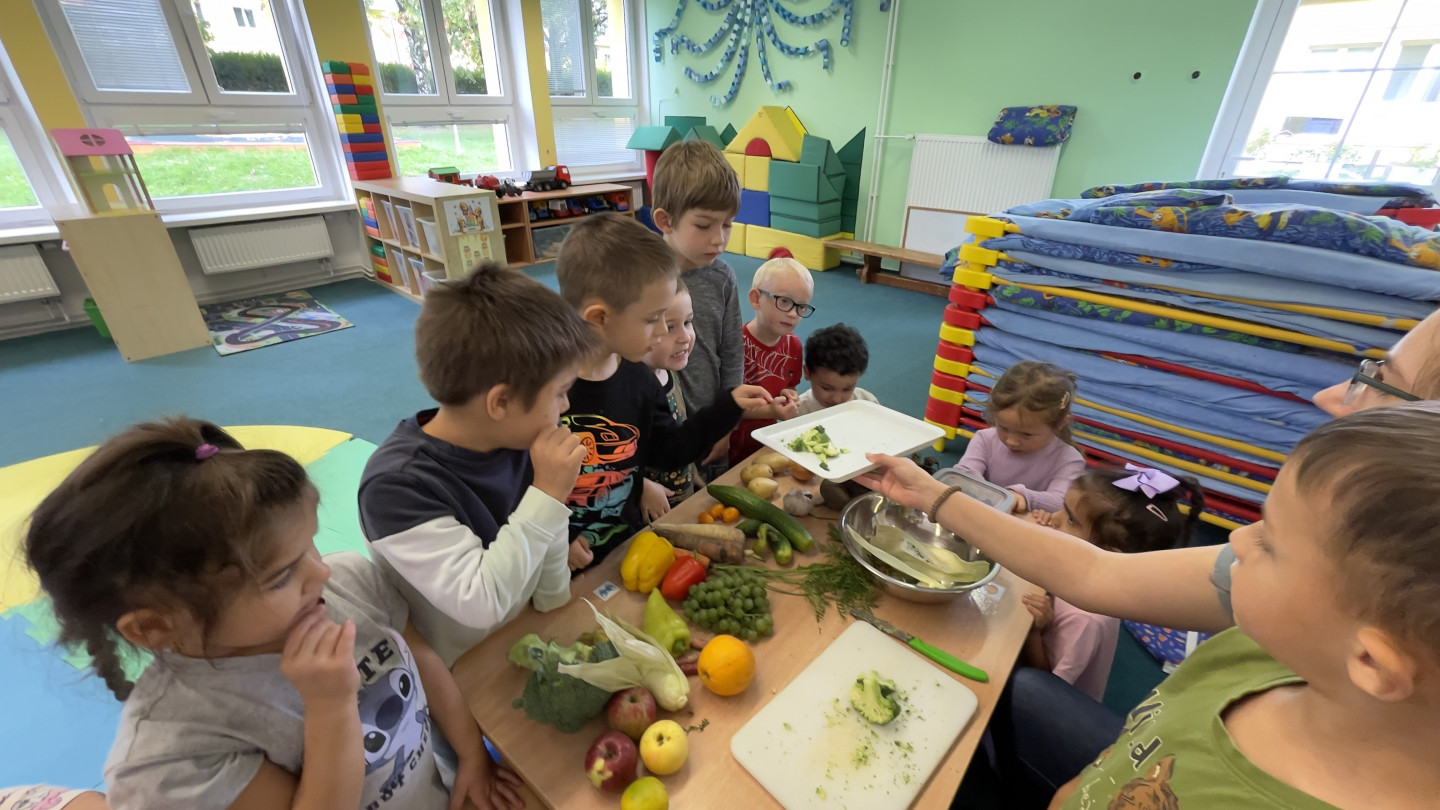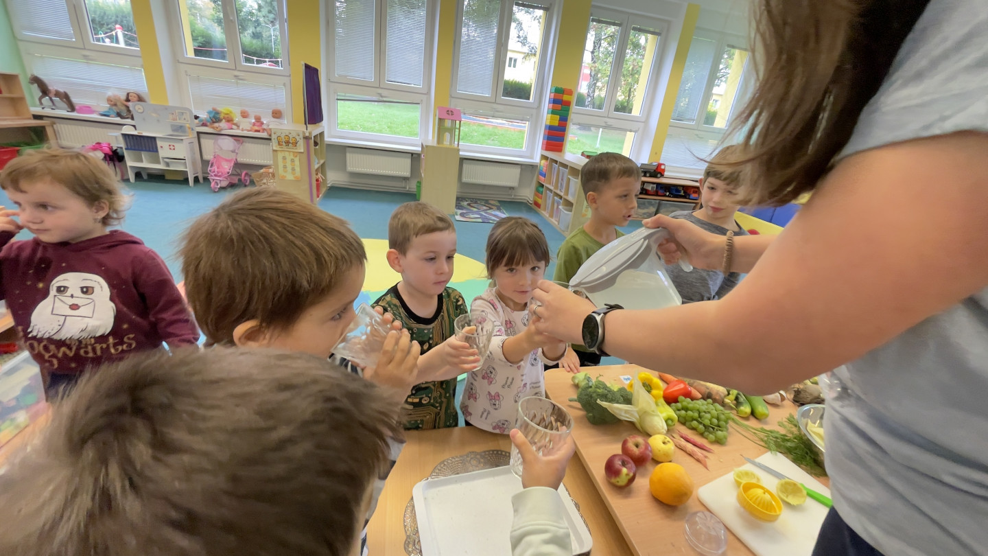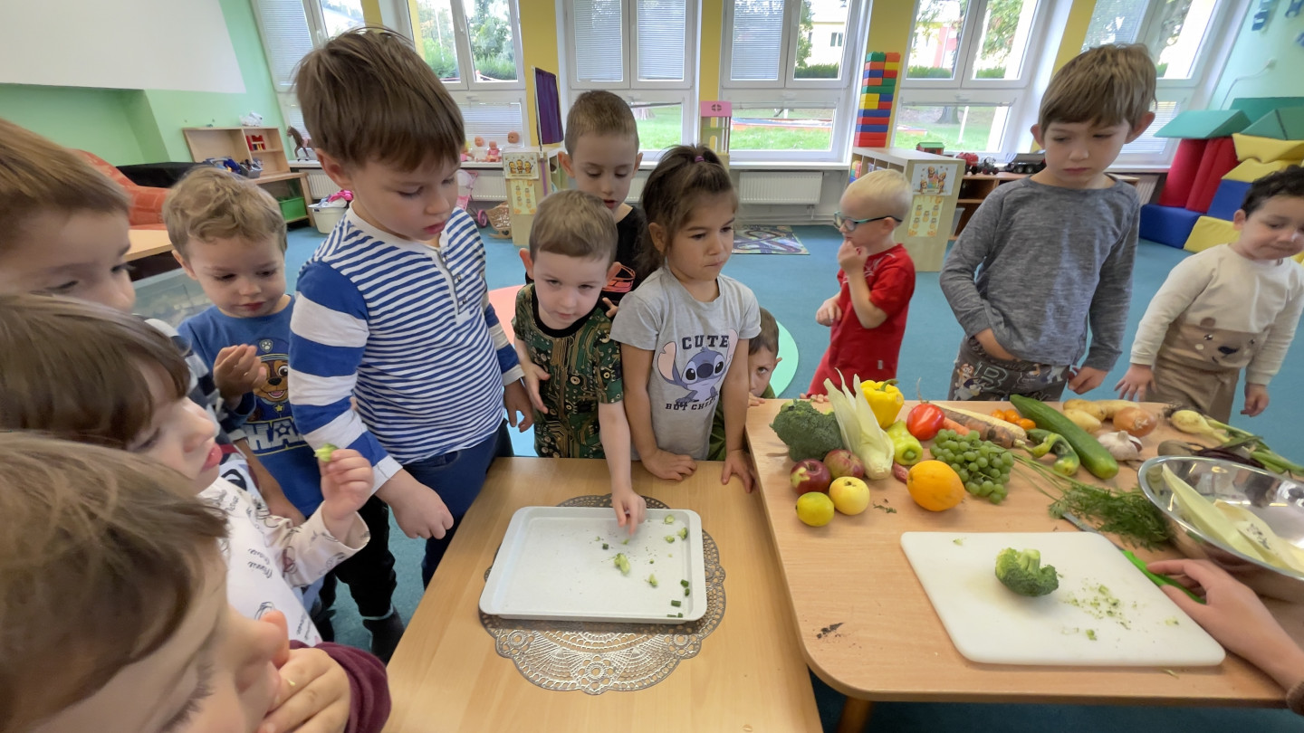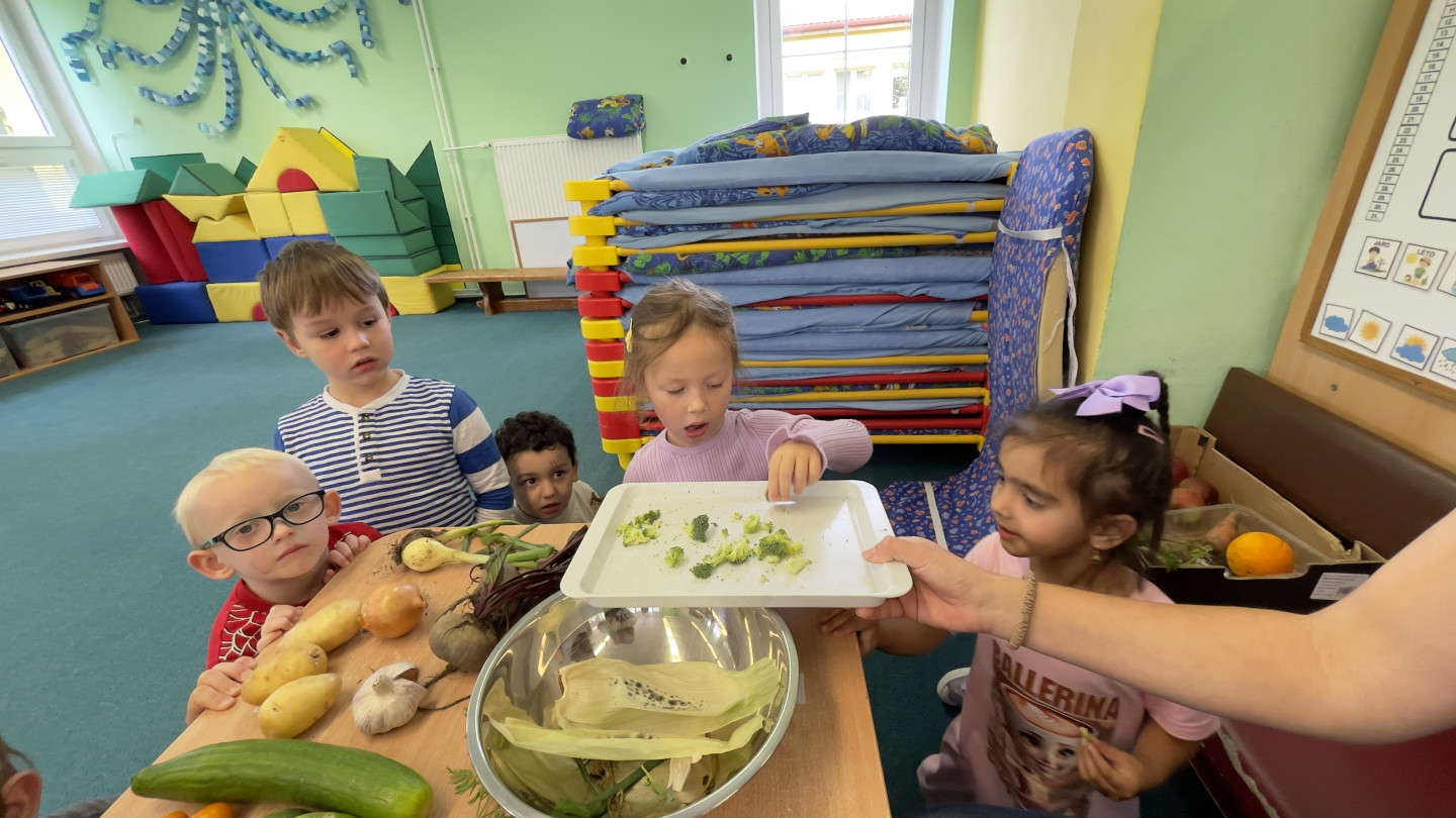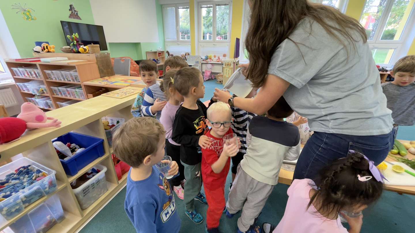 29.9. - S dětmi se věnujeme, krásnému tématu Ovoce a Zelenina. S dětmi jsme ochutnávaly brokolici, hroznové víno, papriku, mrkvičku, i jarní cibulku. Vymačkali jsme šťávu z limetky a udělali si limonádu. Dětem moc chutnala.