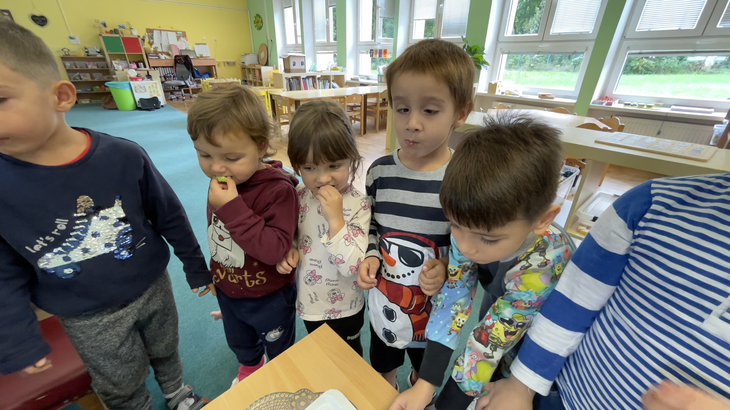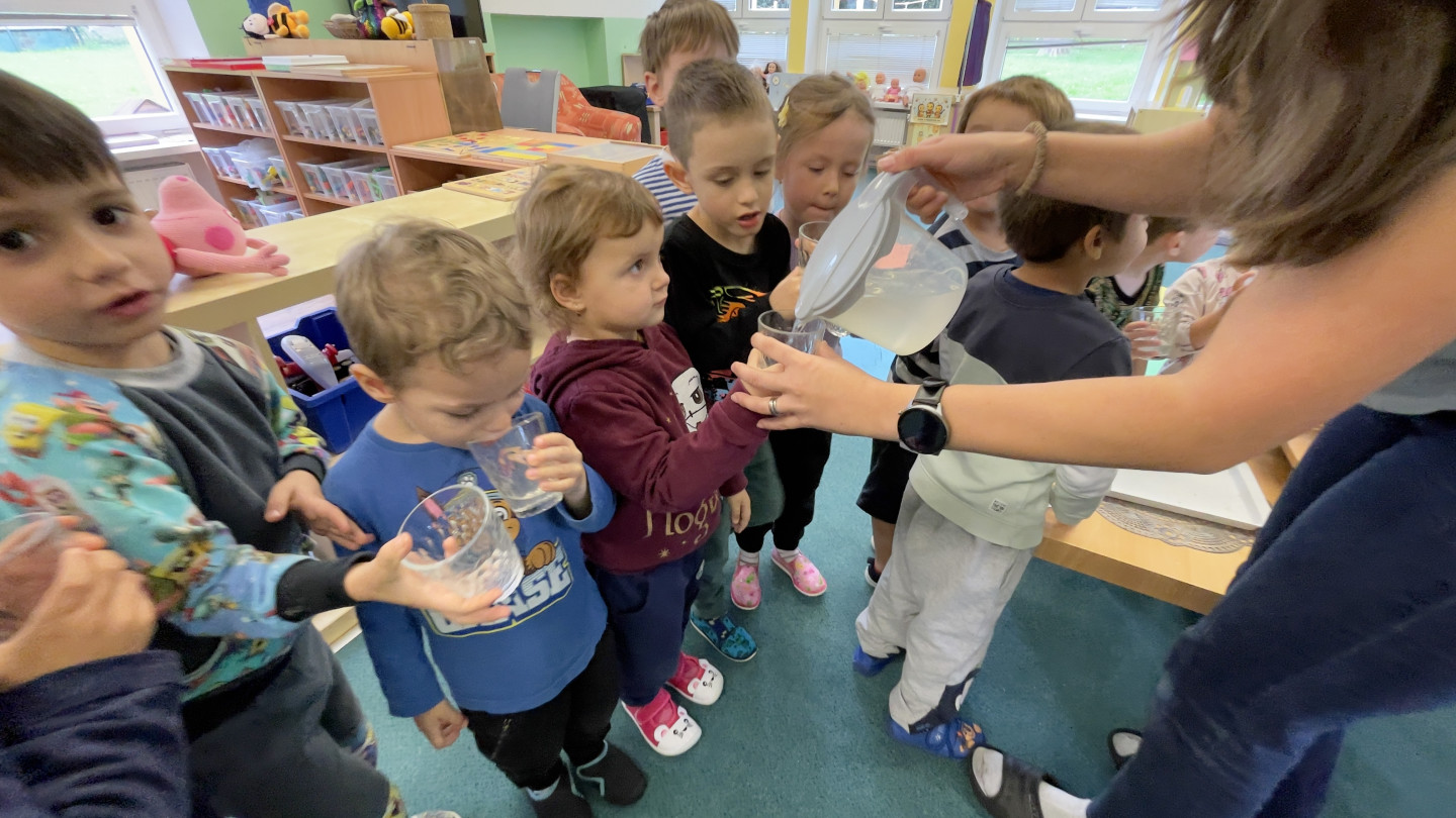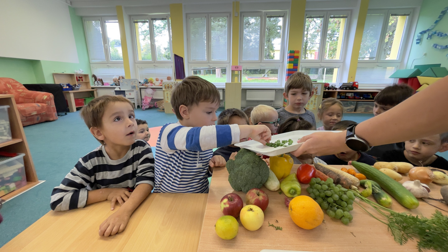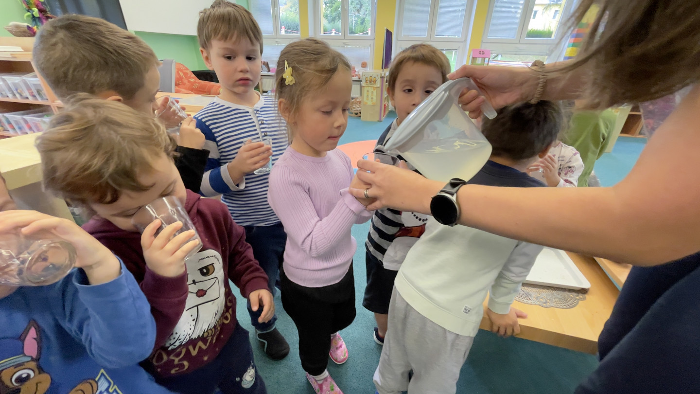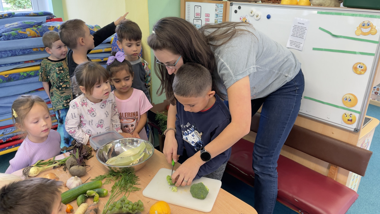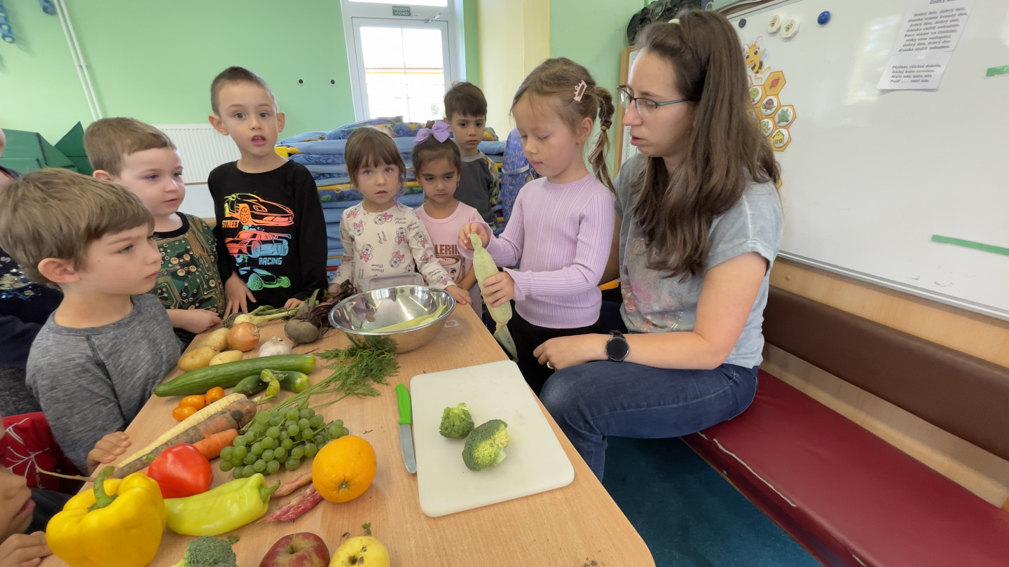 29.9. - S dětmi se věnujeme, krásnému tématu Ovoce a Zelenina. S dětmi jsme ochutnávaly brokolici, hroznové víno, papriku, mrkvičku, i jarní cibulku. Vymačkali jsme šťávu z limetky a udělali si limonádu. Dětem moc chutnala.