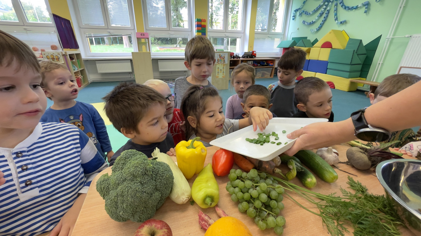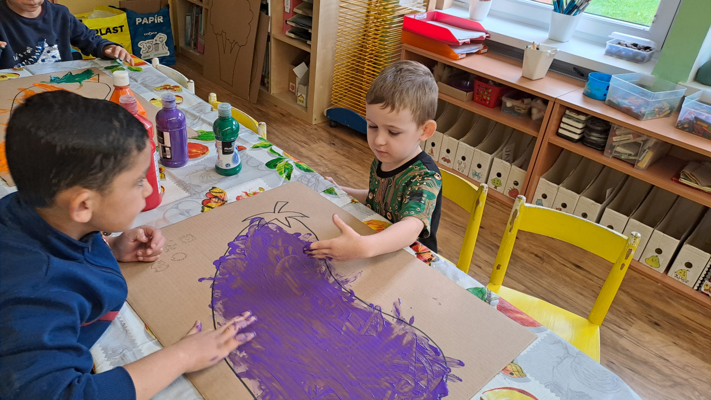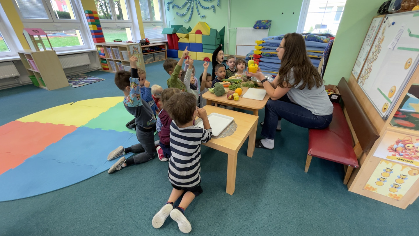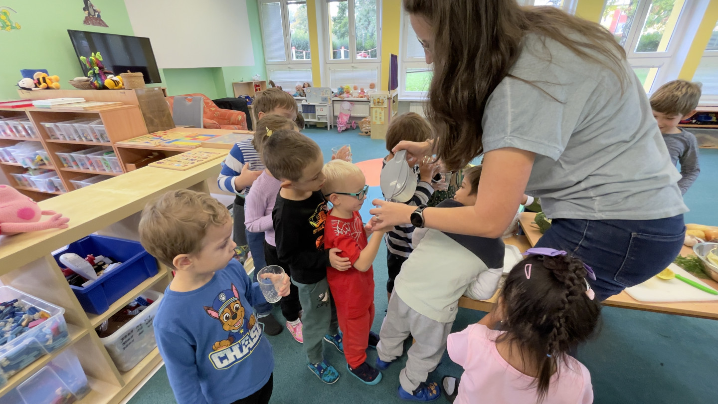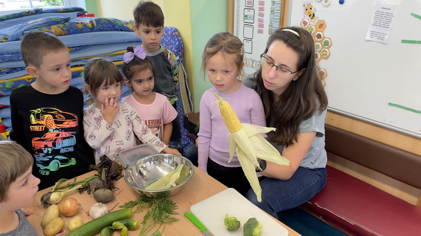 29.9. - S dětmi se věnujeme, krásnému tématu Ovoce a Zelenina. S dětmi jsme ochutnávaly brokolici, hroznové víno, papriku, mrkvičku, i jarní cibulku. Vymačkali jsme šťávu z limetky a udělali si limonádu. Dětem moc chutnala.