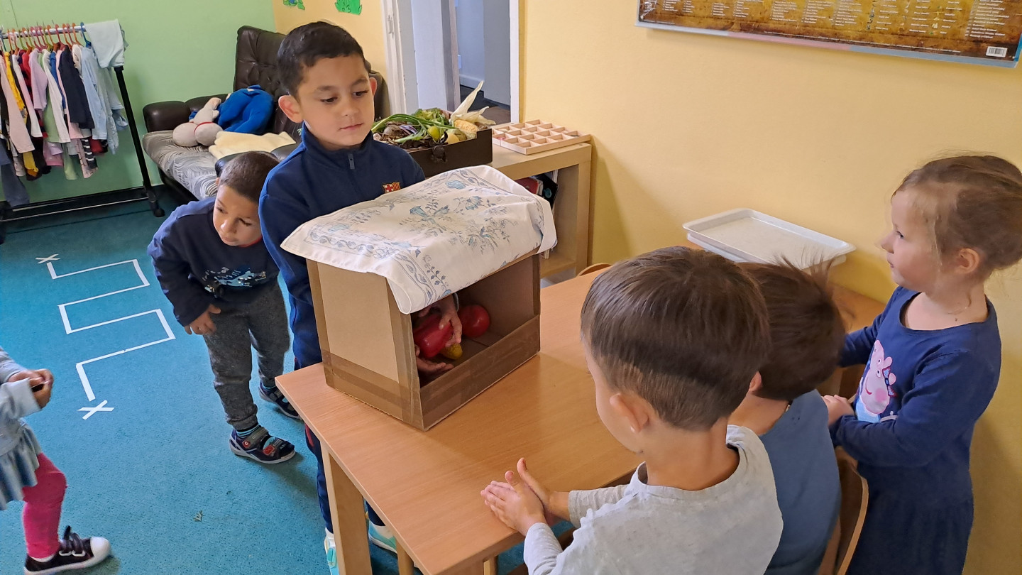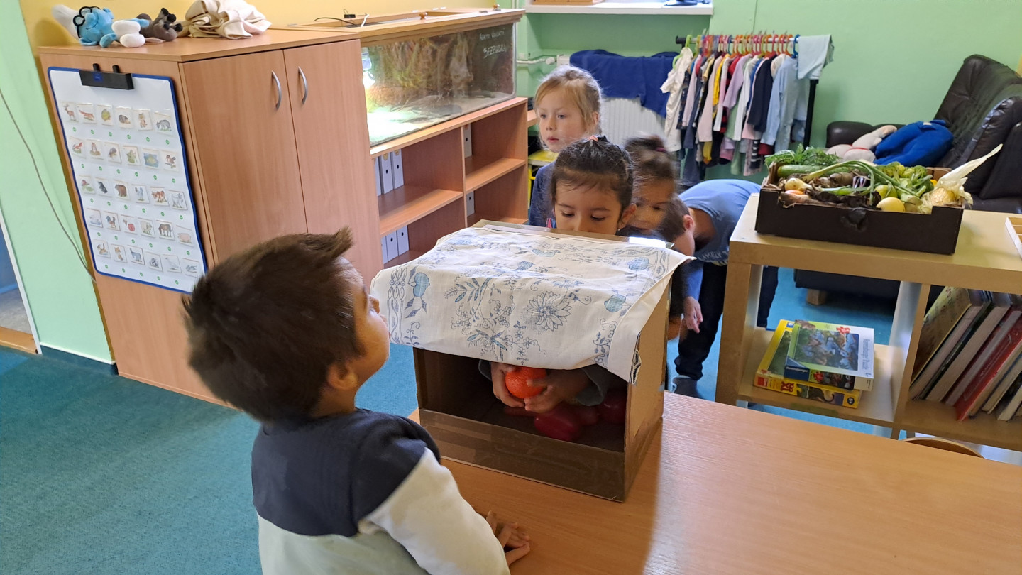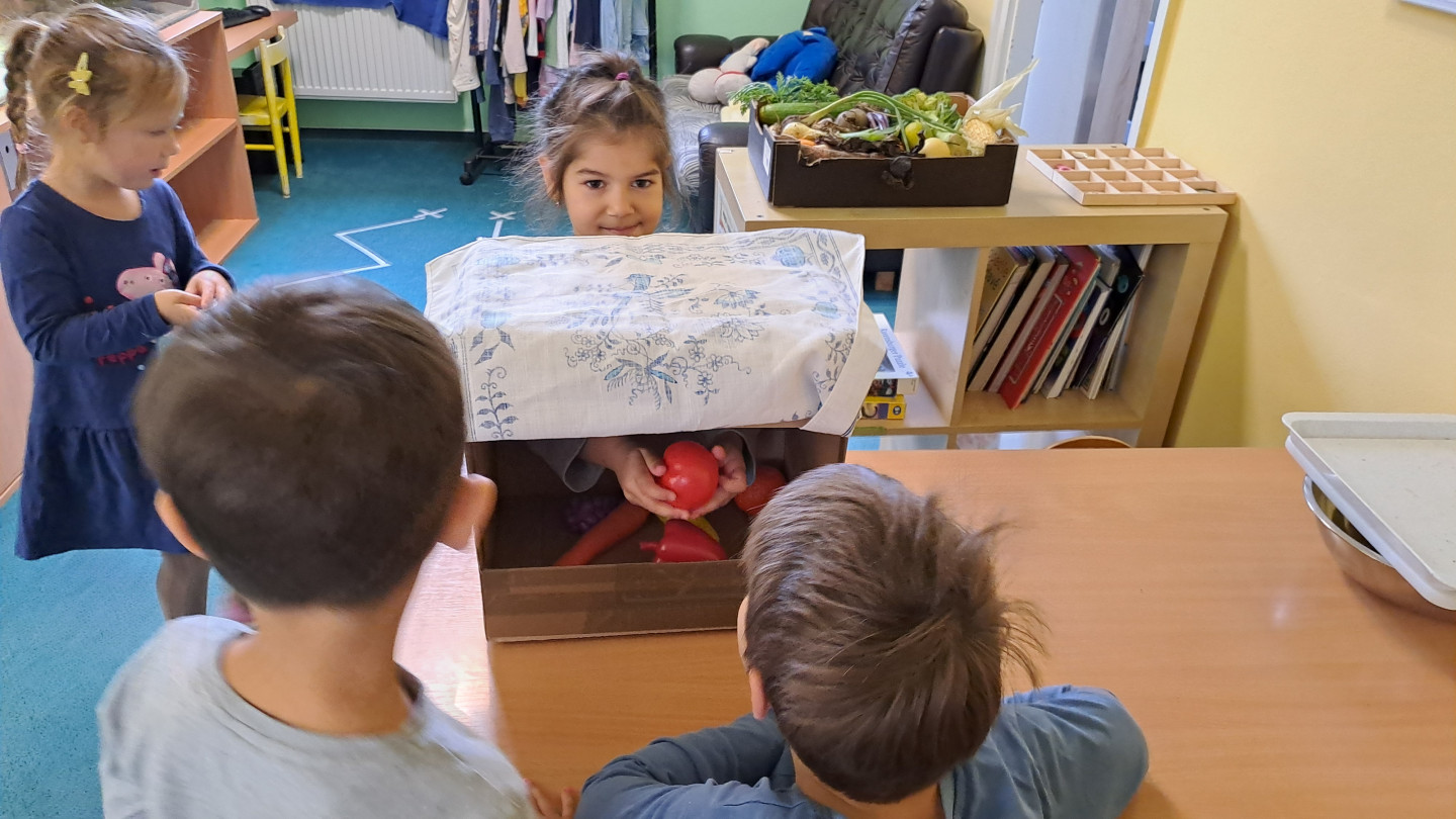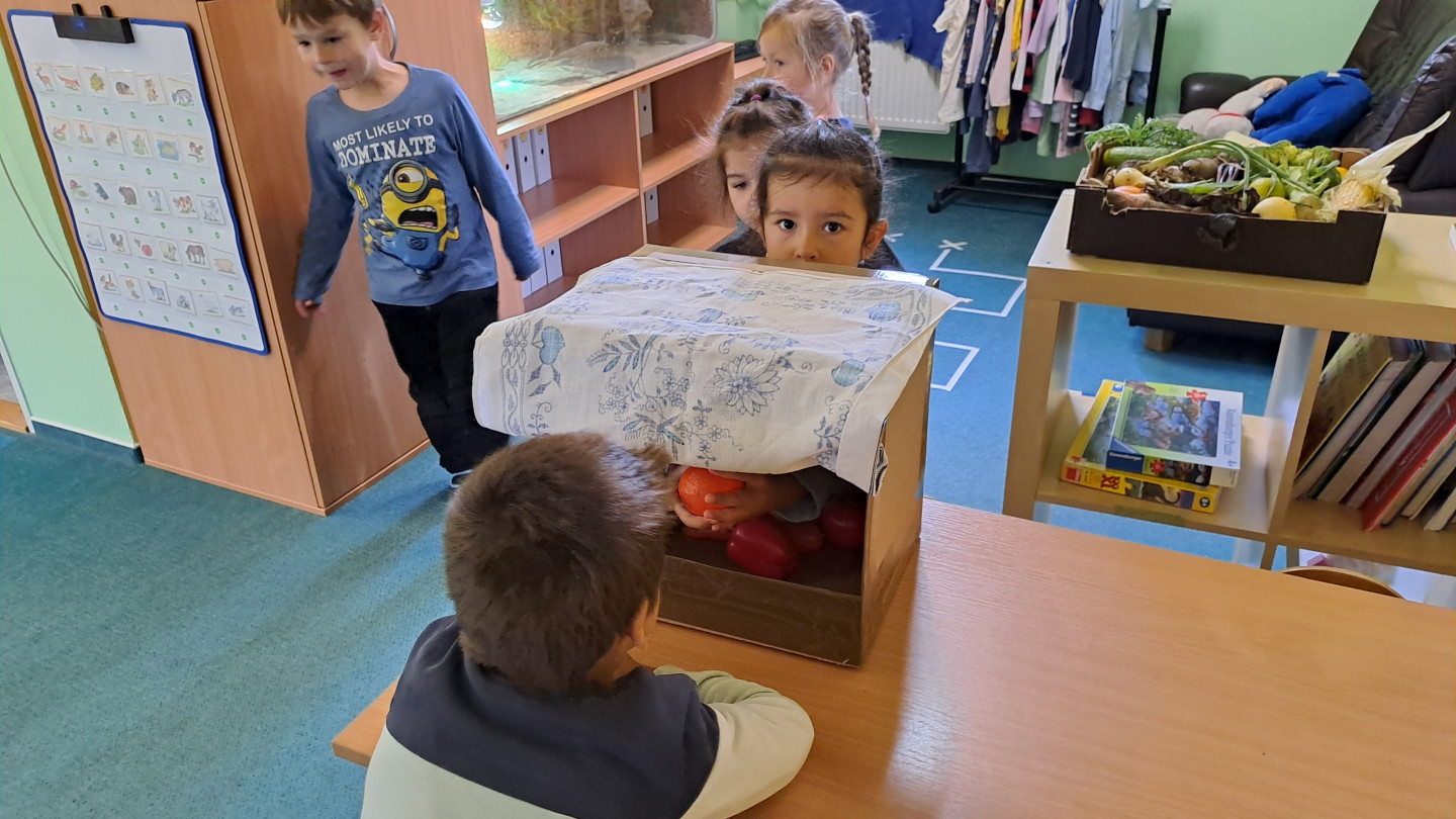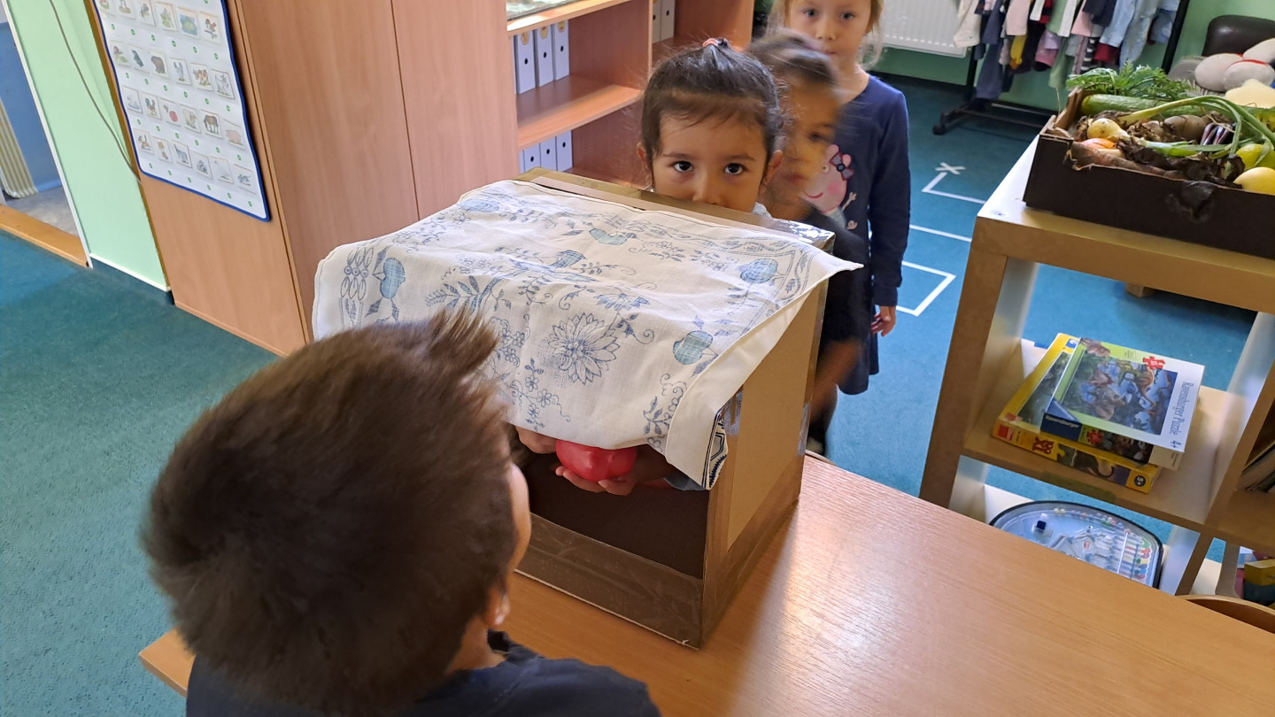 Jedno z aktivit bylo hádat v tajemném boxu jaká zelenina nebo ovoce se tam skrývá, jen za pomoci hmatu.