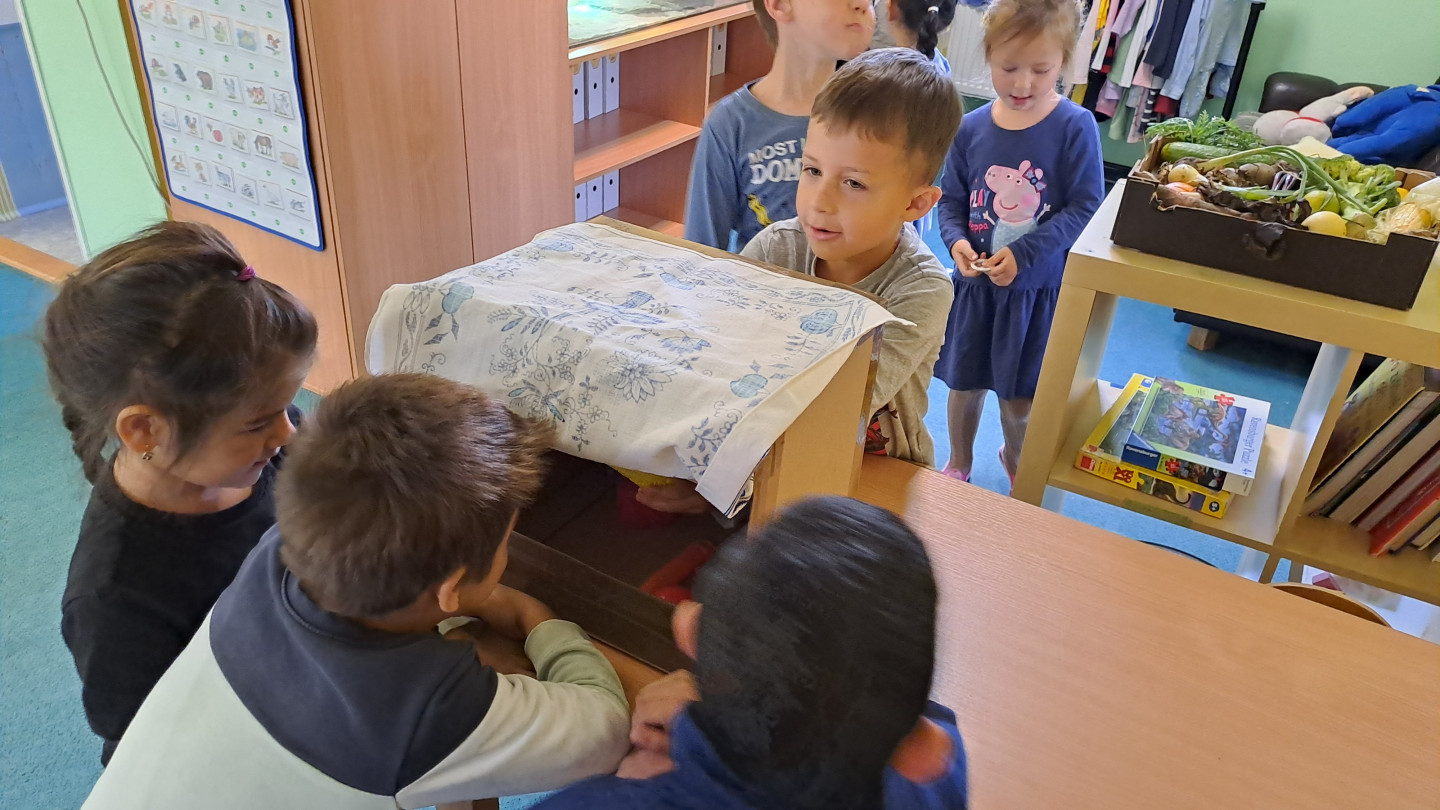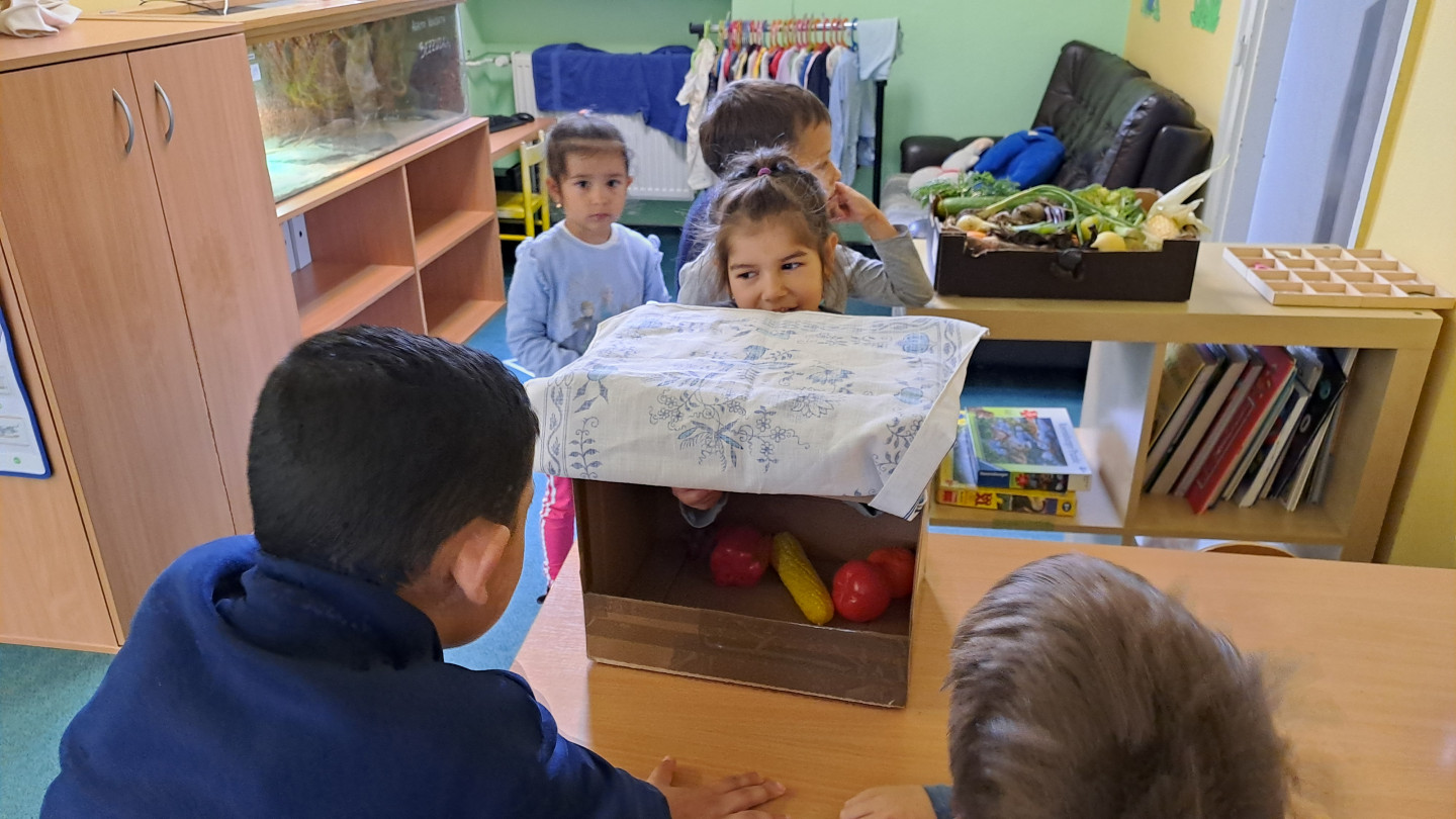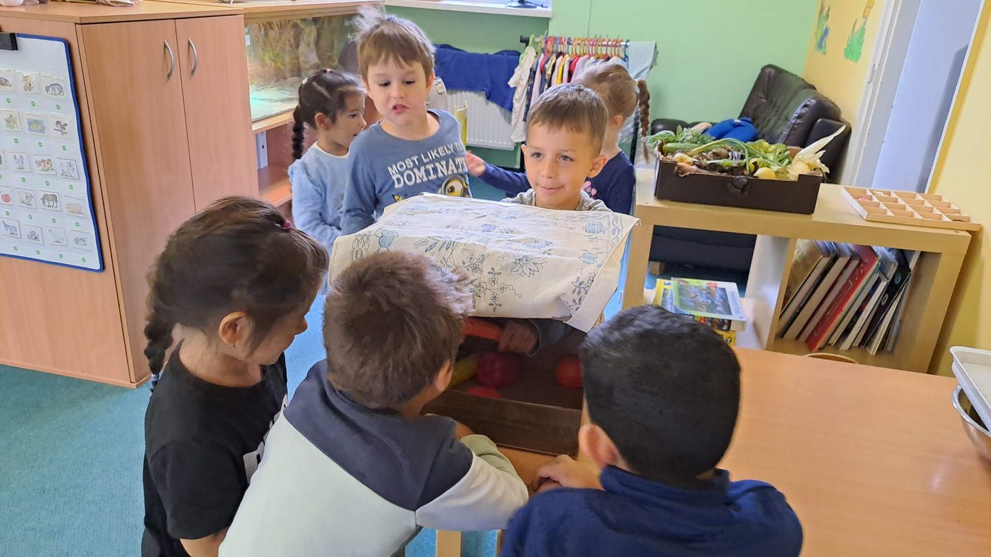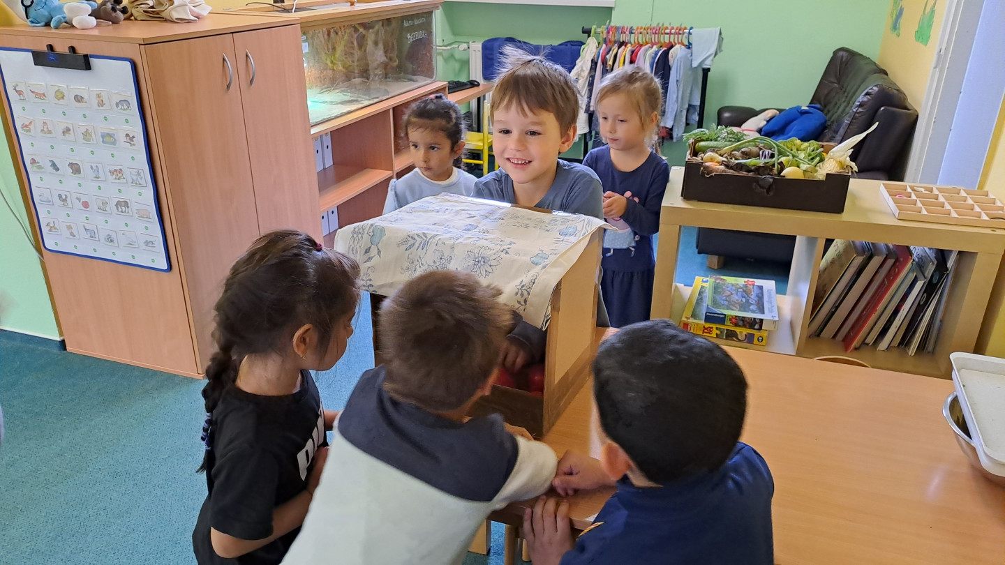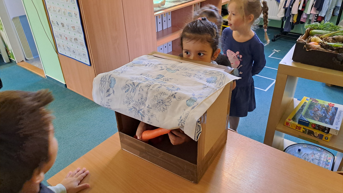 Jedno z aktivit bylo hádat v tajemném boxu jaká zelenina nebo ovoce se tam skrývá, jen za pomoci hmatu.