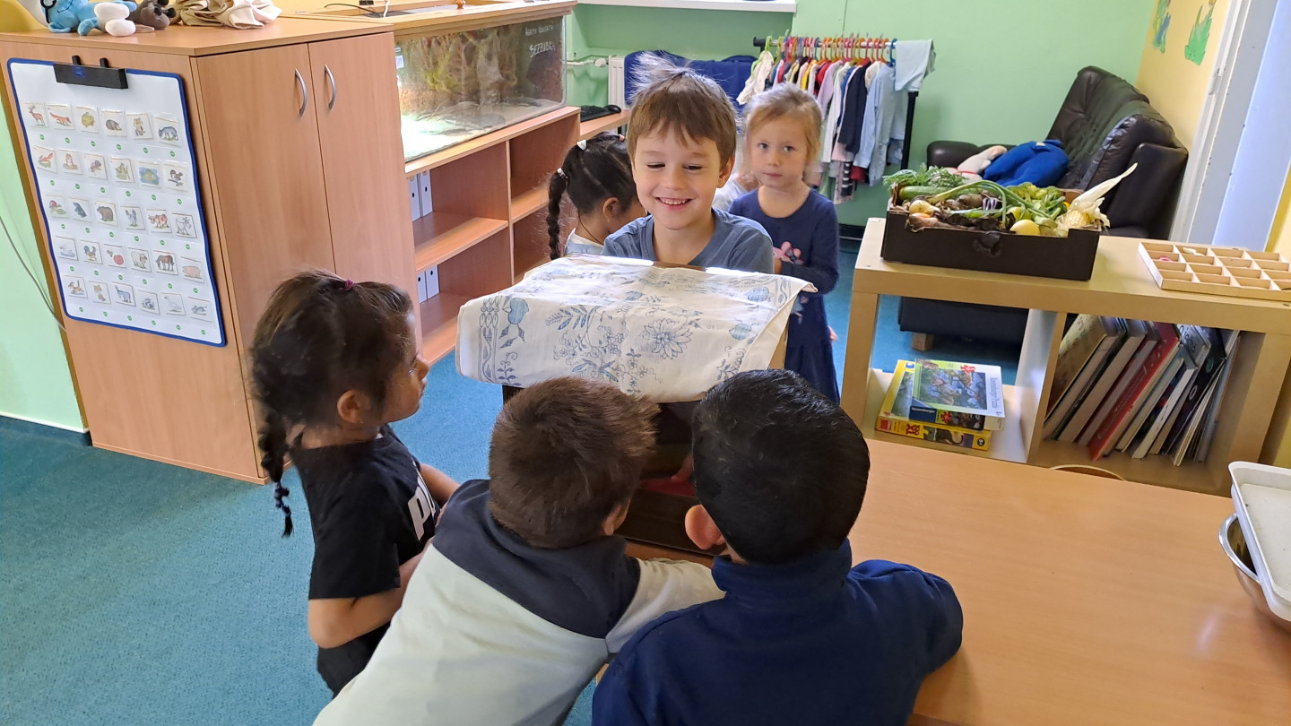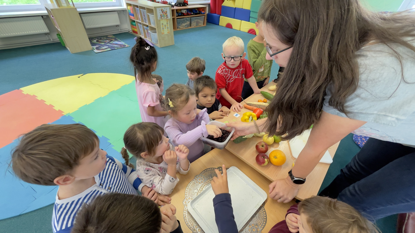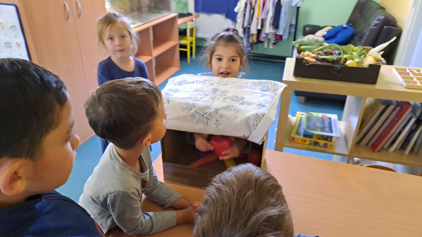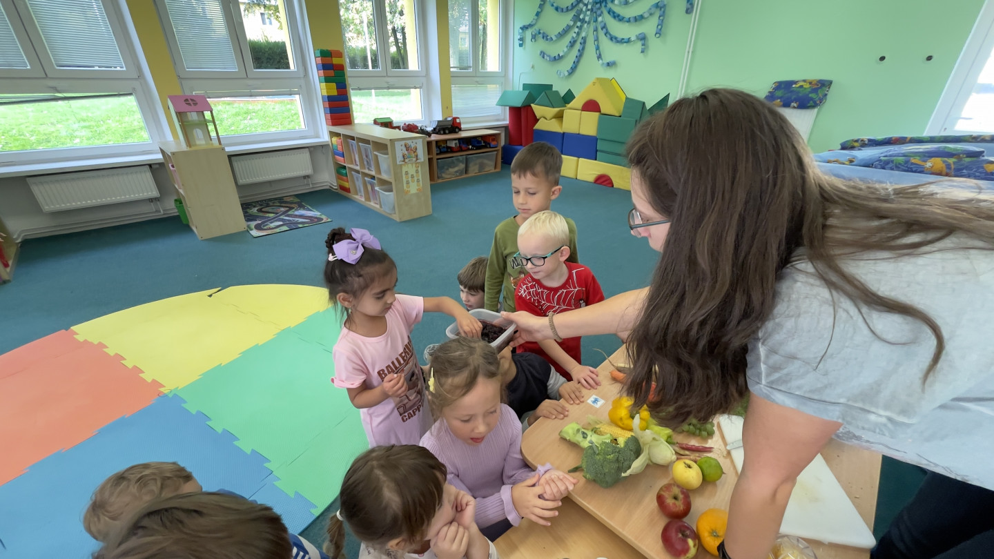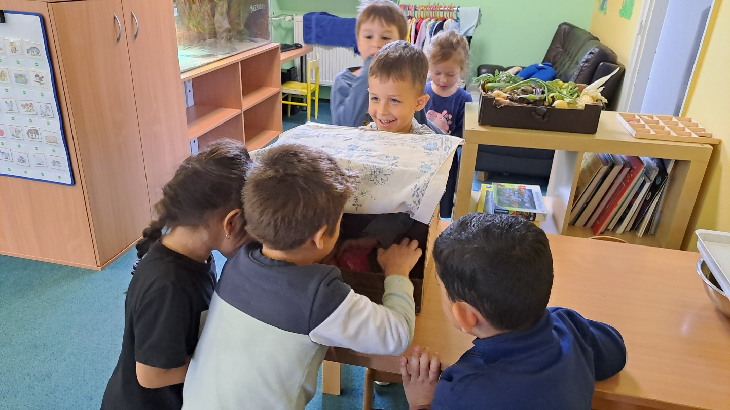 Jedno z aktivit bylo hádat v tajemném boxu jaká zelenina nebo ovoce se tam skrývá, jen za pomoci hmatu.
