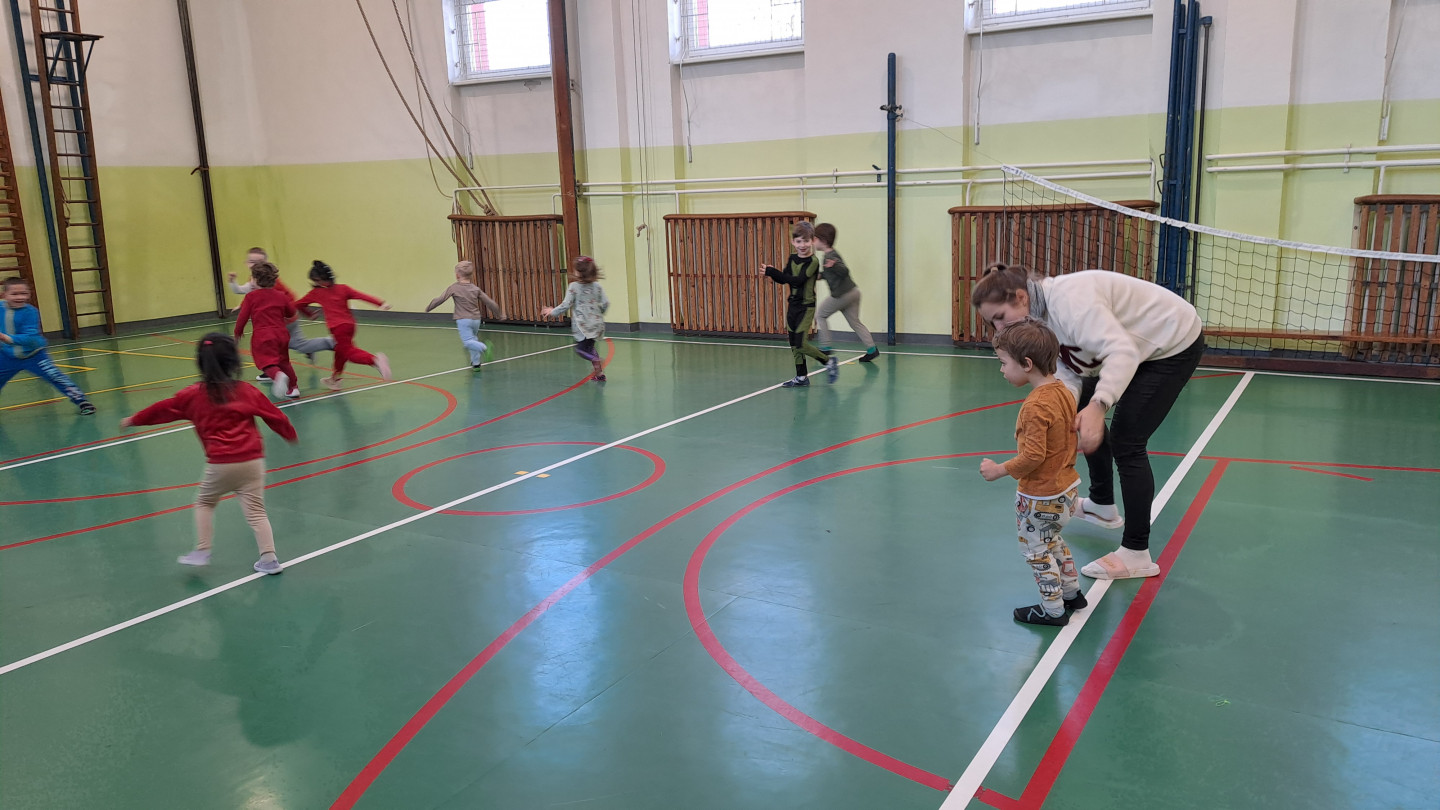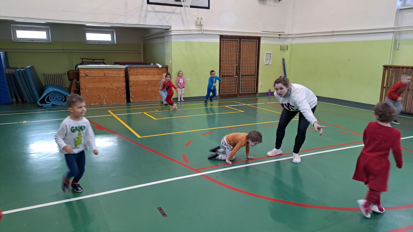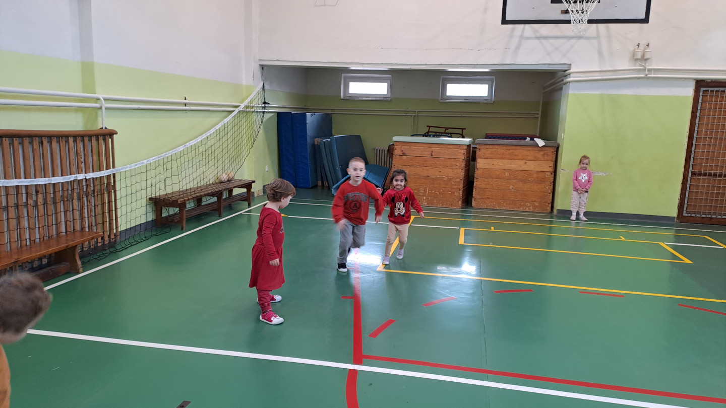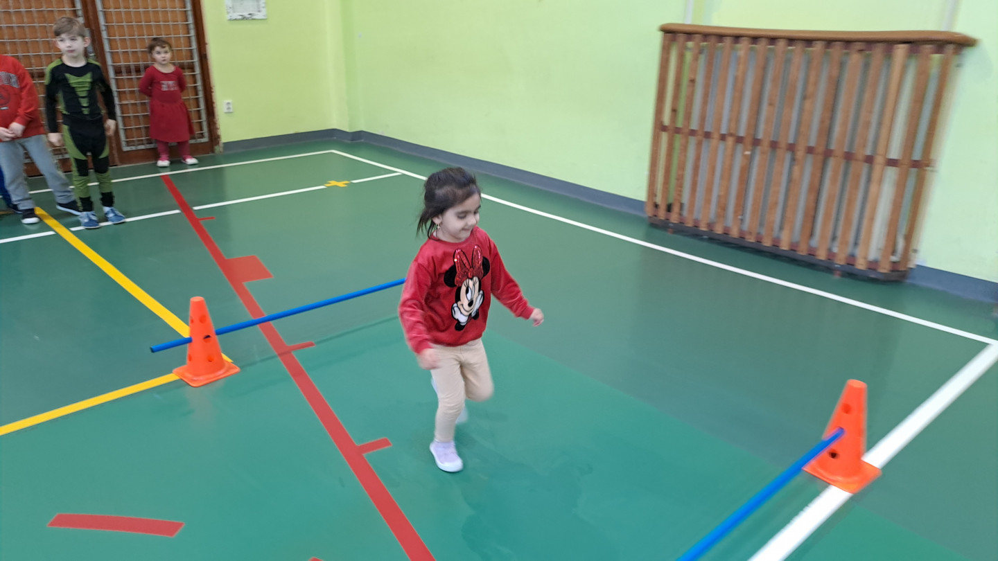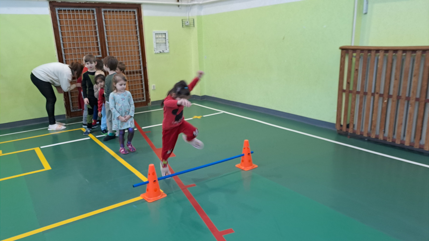 Dětem jsme připravily překážkovou dráhu a poté jsme si zahrály hru na Bacil. Děti utíkaly před bacilem (paní učitelkou) a kdo byl chycený tak roztahl nohy a musel počkat na Vitamín (Daneček), který děti vylečil podlezením.