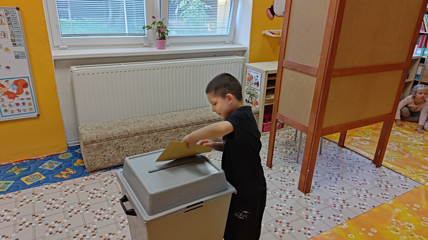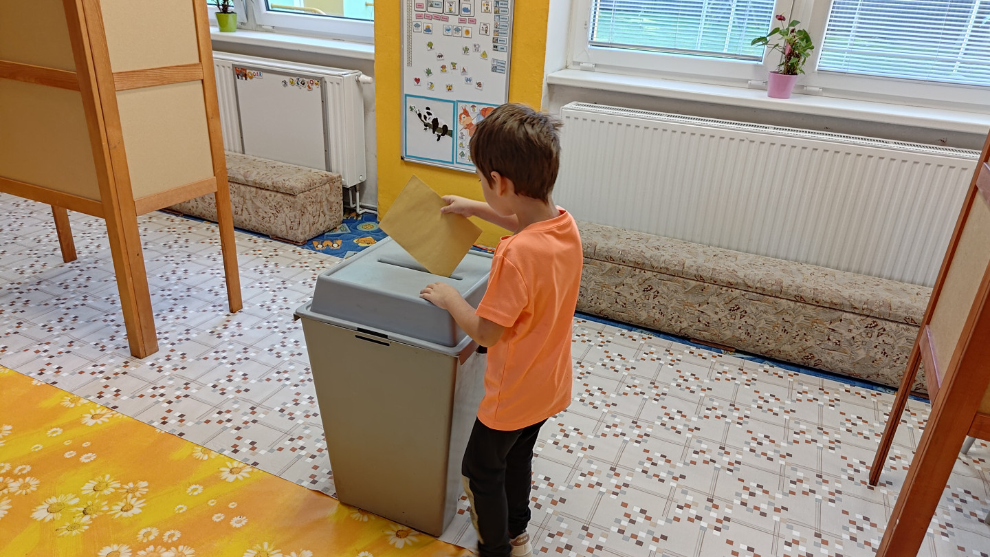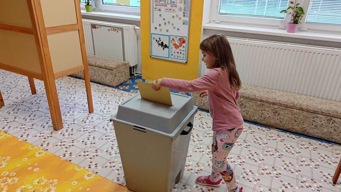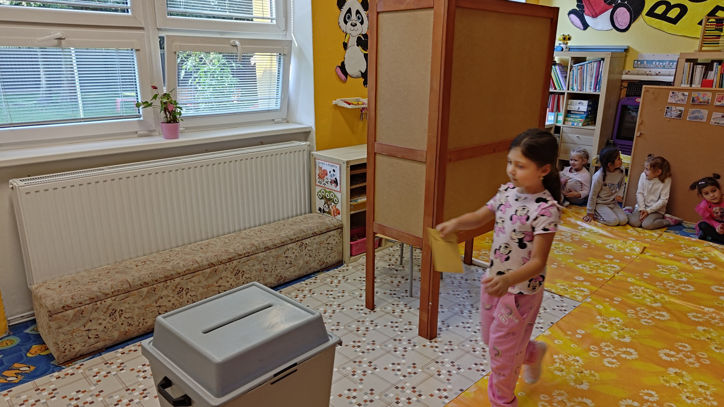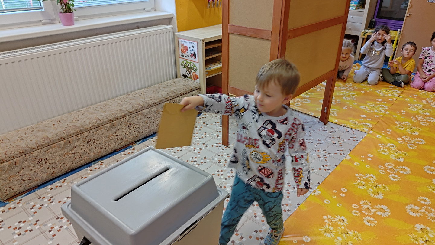 Dnes se naše třída změnila ve volební místnost, kde odpoledne proběhnou volby do poslanecké sněmovny. Proto jsme se rozhodly vysvětlit dětem, co tady budou dospěláci dělat a jak to vše bude probíhat. Rozhodly jsme se vyhlasit volbu o nejoblíbenější hračku v mateřské škole. Vybraly jsme 8 hraček nebo stavebnic a děti rozhodly. Přišly do volební místnosti, představily se a díky tomu dostaly volební lístek a obálku. Tajně rozhodly, lístek vložily do obálky a obálku vhodily do urny. Výsledek byl překvapivý. Doufáme, že i dospěláci budou stejně překvapeni.