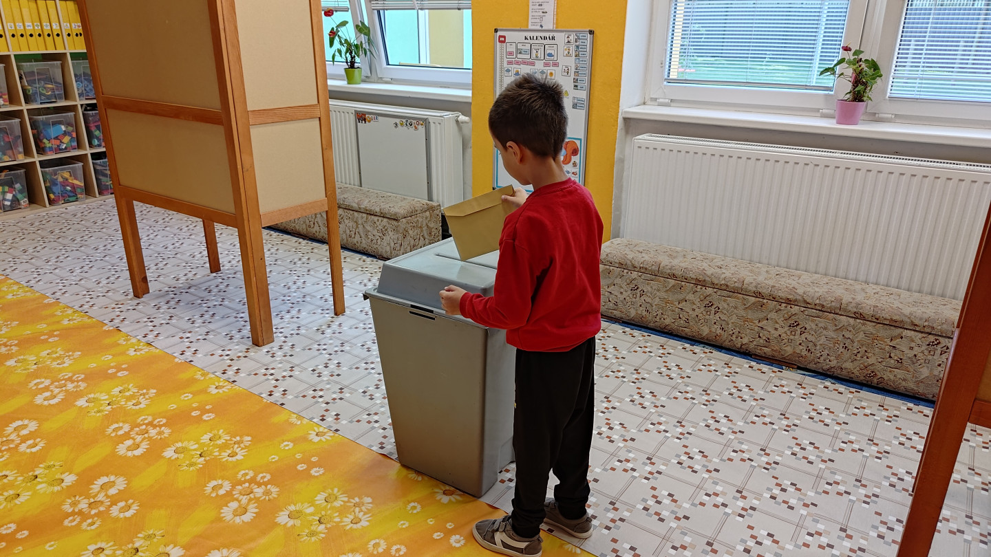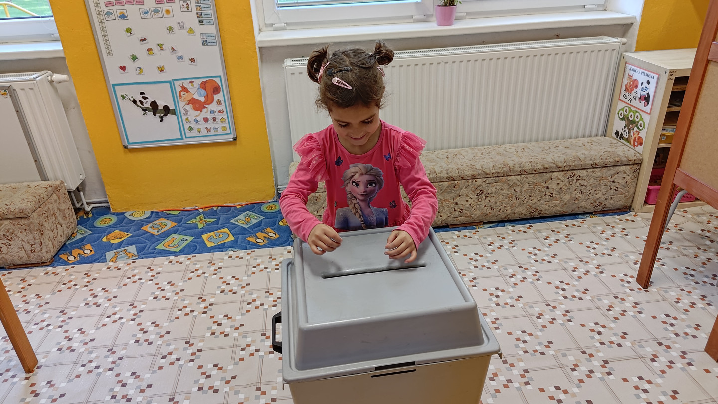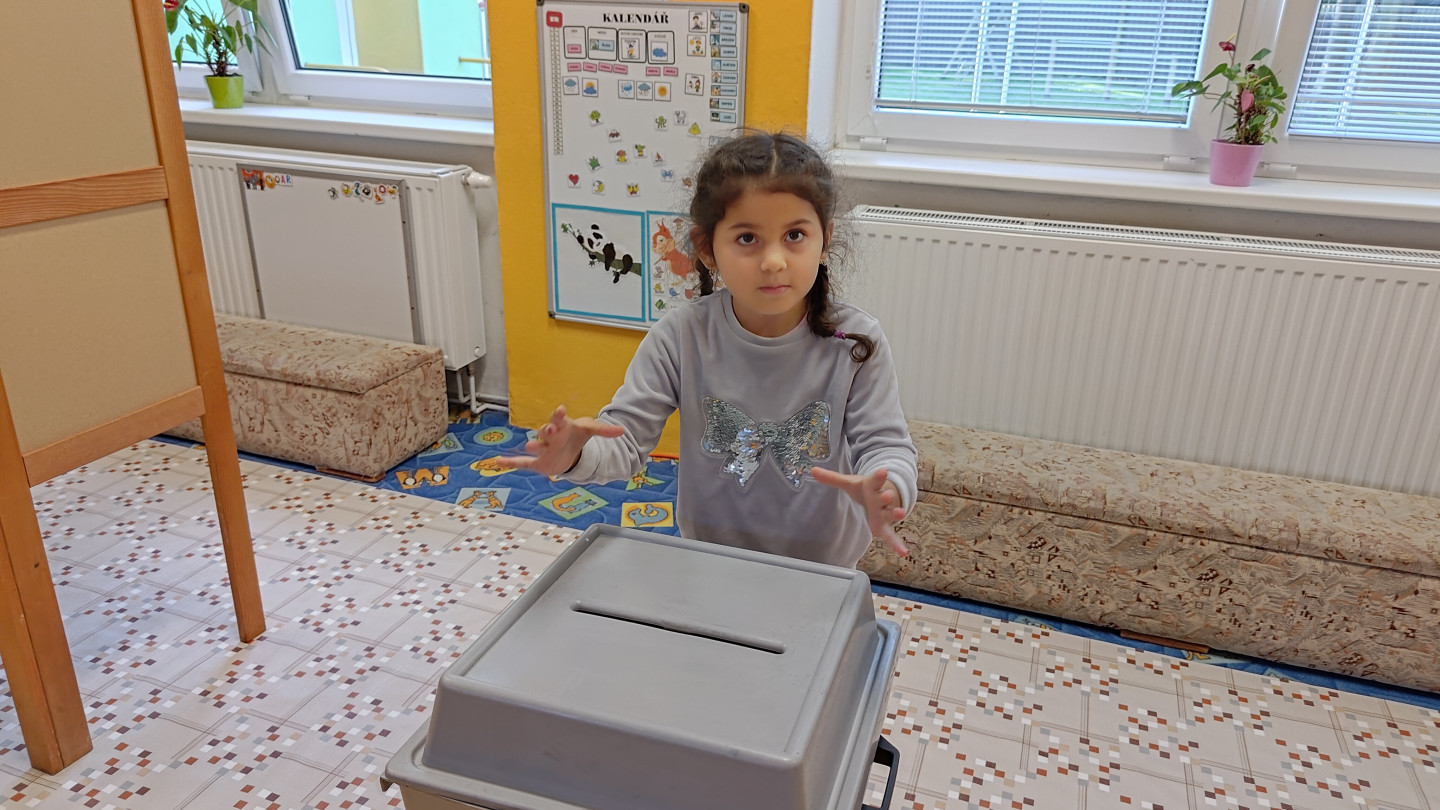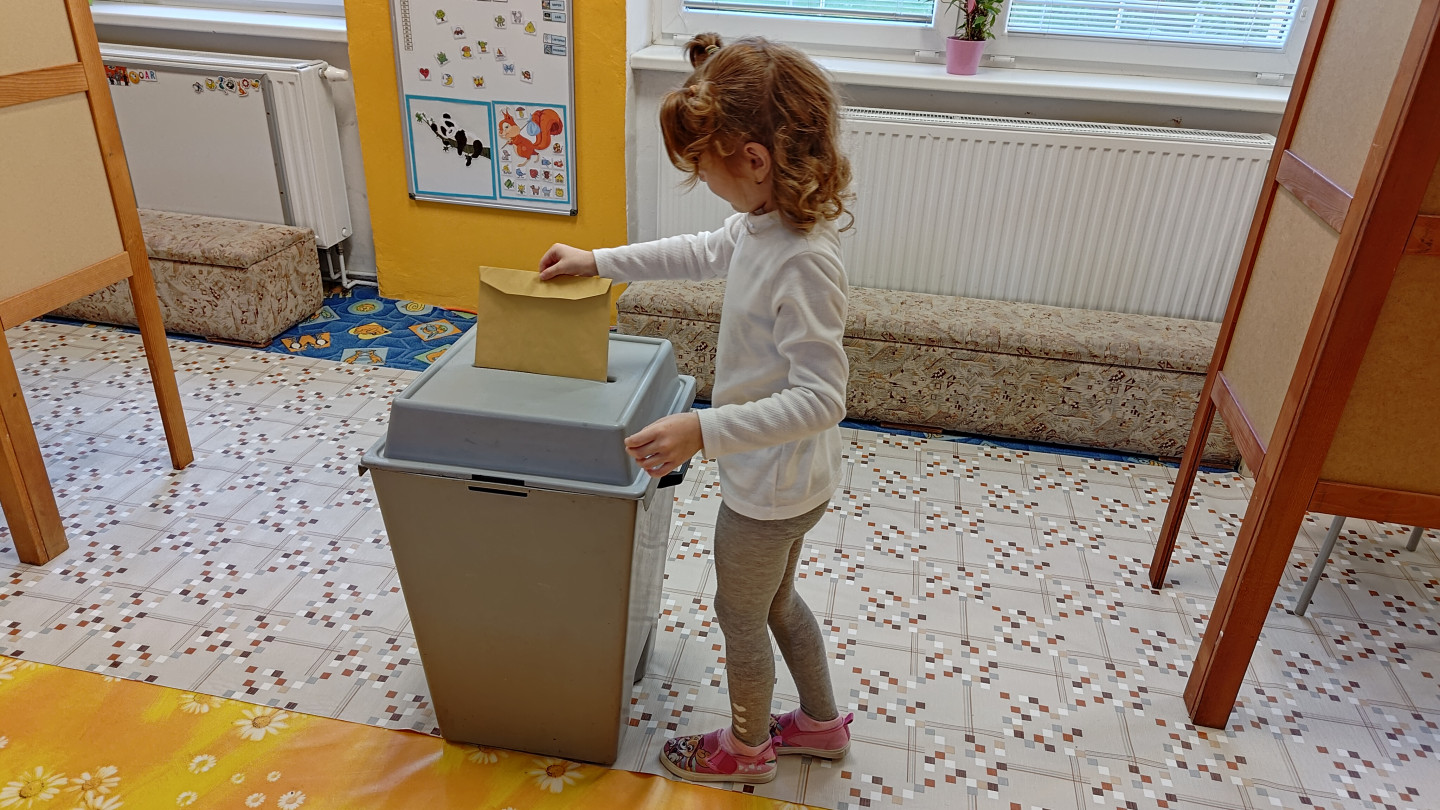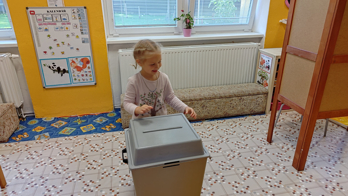 Dnes se naše třída změnila ve volební místnost, kde odpoledne proběhnou volby do poslanecké sněmovny. Proto jsme se rozhodly vysvětlit dětem, co tady budou dospěláci dělat a jak to vše bude probíhat. Rozhodly jsme se vyhlasit volbu o nejoblíbenější hračku v mateřské škole. Vybraly jsme 8 hraček nebo stavebnic a děti rozhodly. Přišly do volební místnosti, představily se a díky tomu dostaly volební lístek a obálku. Tajně rozhodly, lístek vložily do obálky a obálku vhodily do urny. Výsledek byl překvapivý. Doufáme, že i dospěláci budou stejně překvapeni.