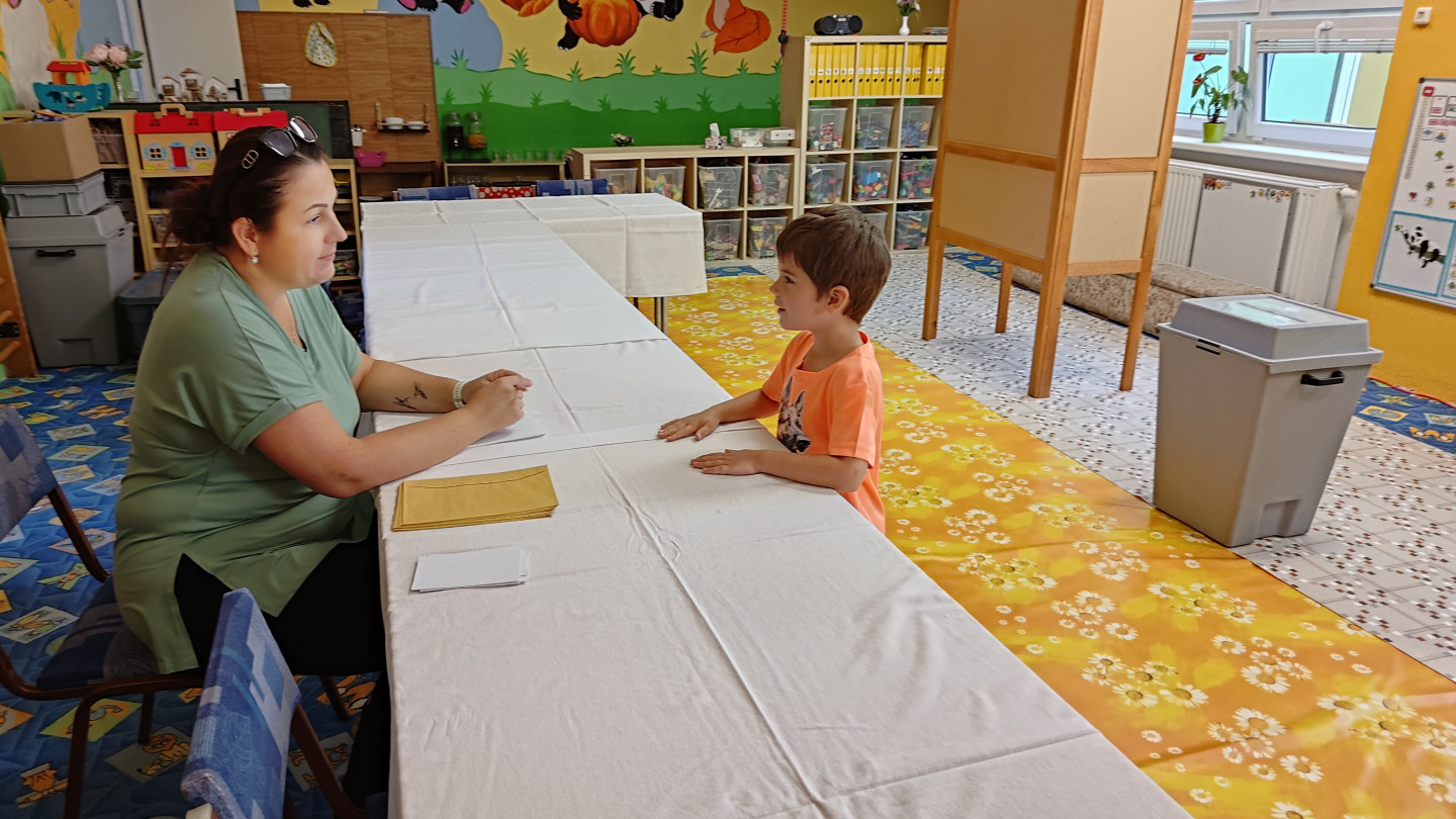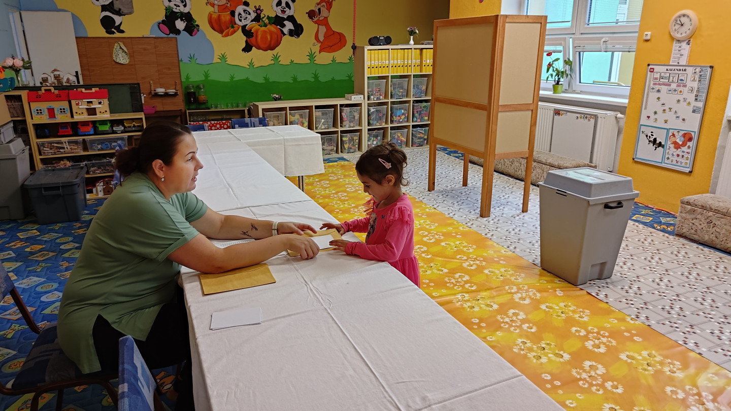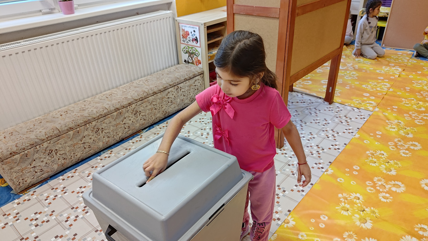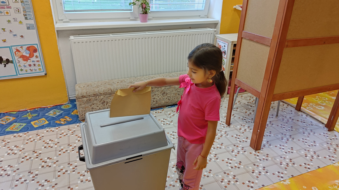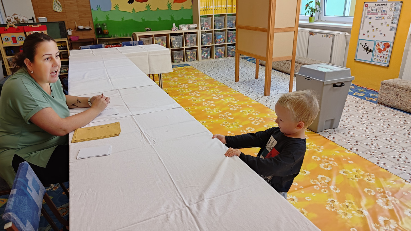 Dnes se naše třída změnila ve volební místnost, kde odpoledne proběhnou volby do poslanecké sněmovny. Proto jsme se rozhodly vysvětlit dětem, co tady budou dospěláci dělat a jak to vše bude probíhat. Rozhodly jsme se vyhlasit volbu o nejoblíbenější hračku v mateřské škole. Vybraly jsme 8 hraček nebo stavebnic a děti rozhodly. Přišly do volební místnosti, představily se a díky tomu dostaly volební lístek a obálku. Tajně rozhodly, lístek vložily do obálky a obálku vhodily do urny. Výsledek byl překvapivý. Doufáme, že i dospěláci budou stejně překvapeni.