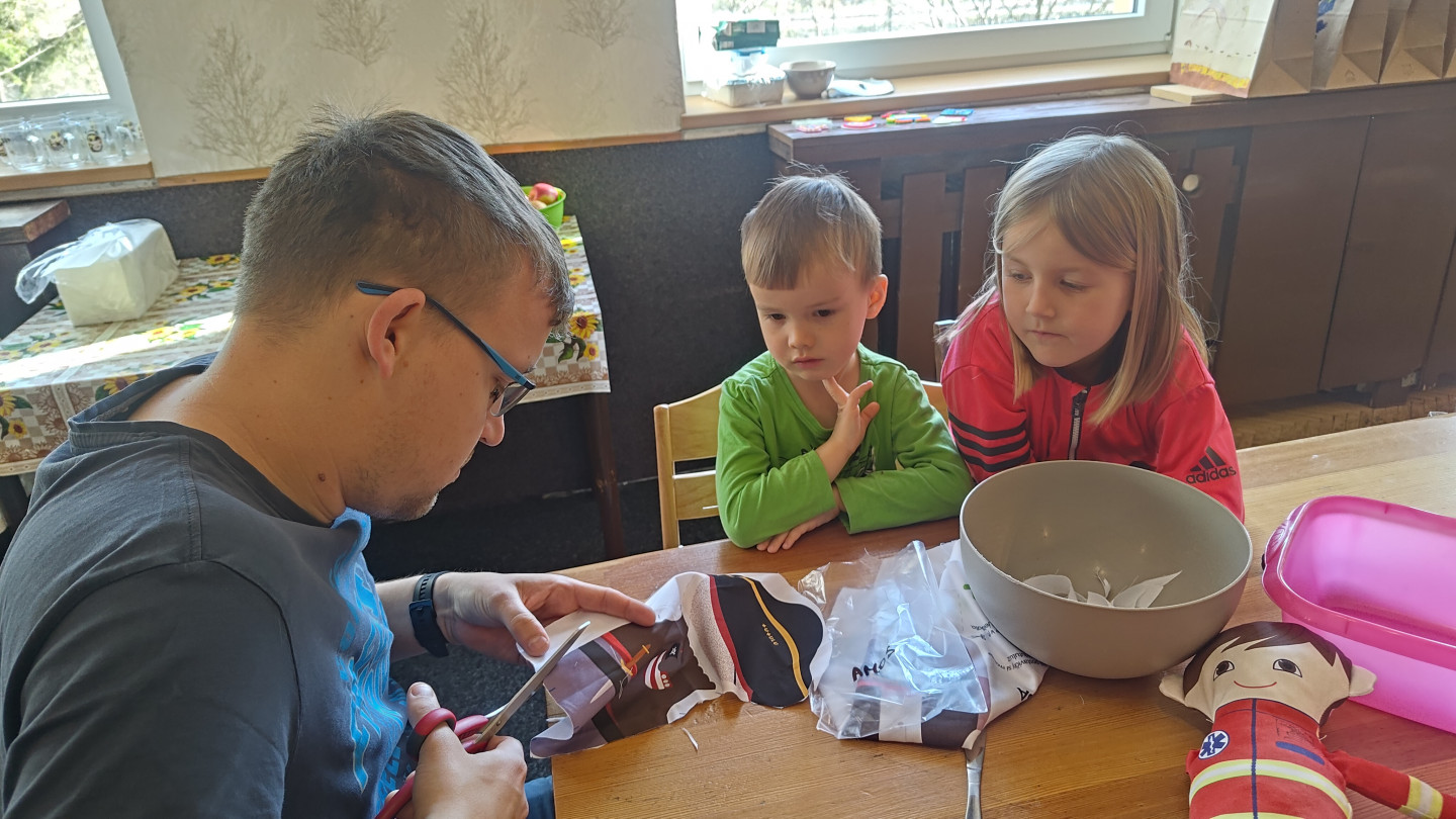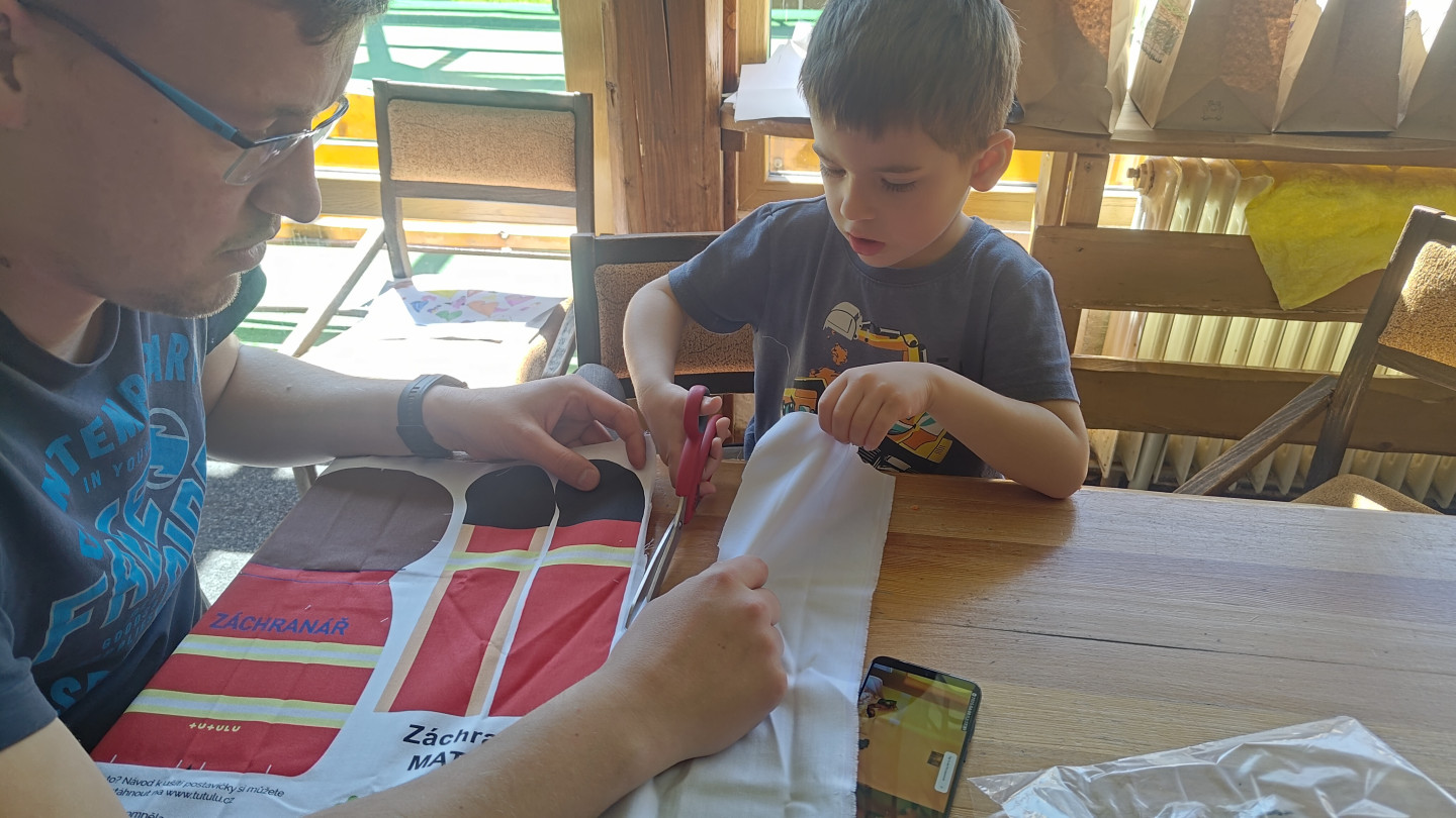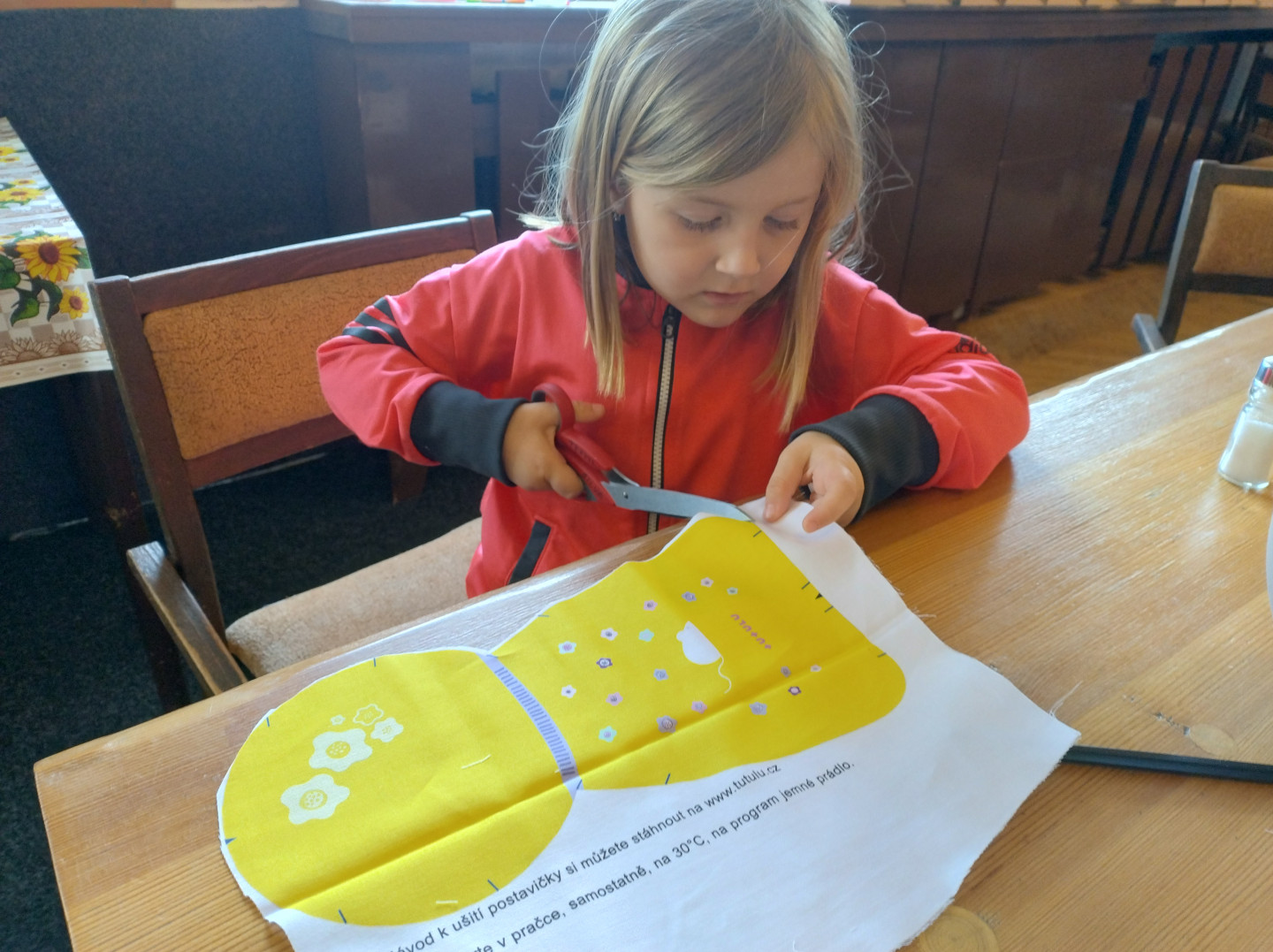 Dopoledne si někteří stříhali látku na látkové postavičky, jiní si hráli v herně.