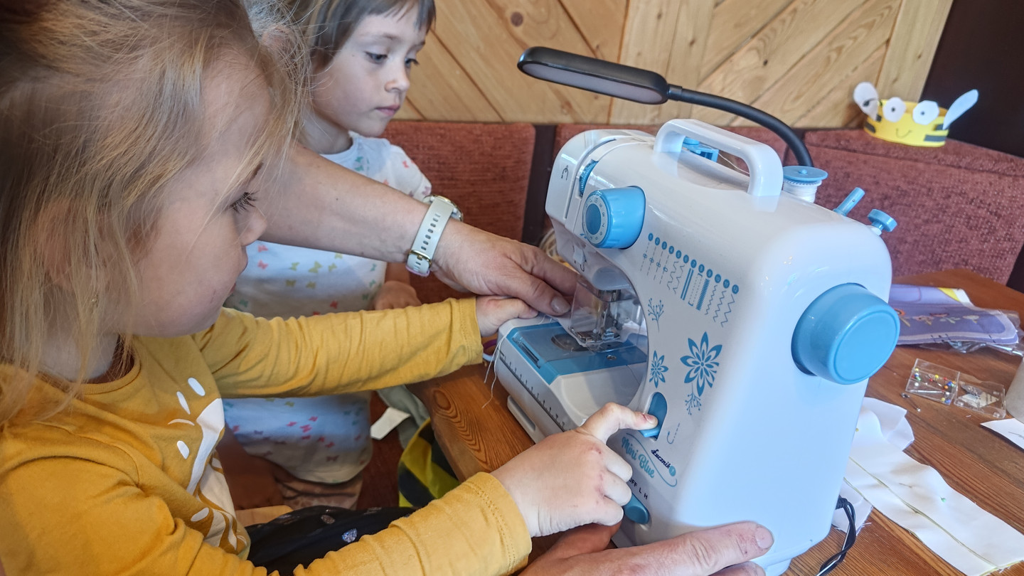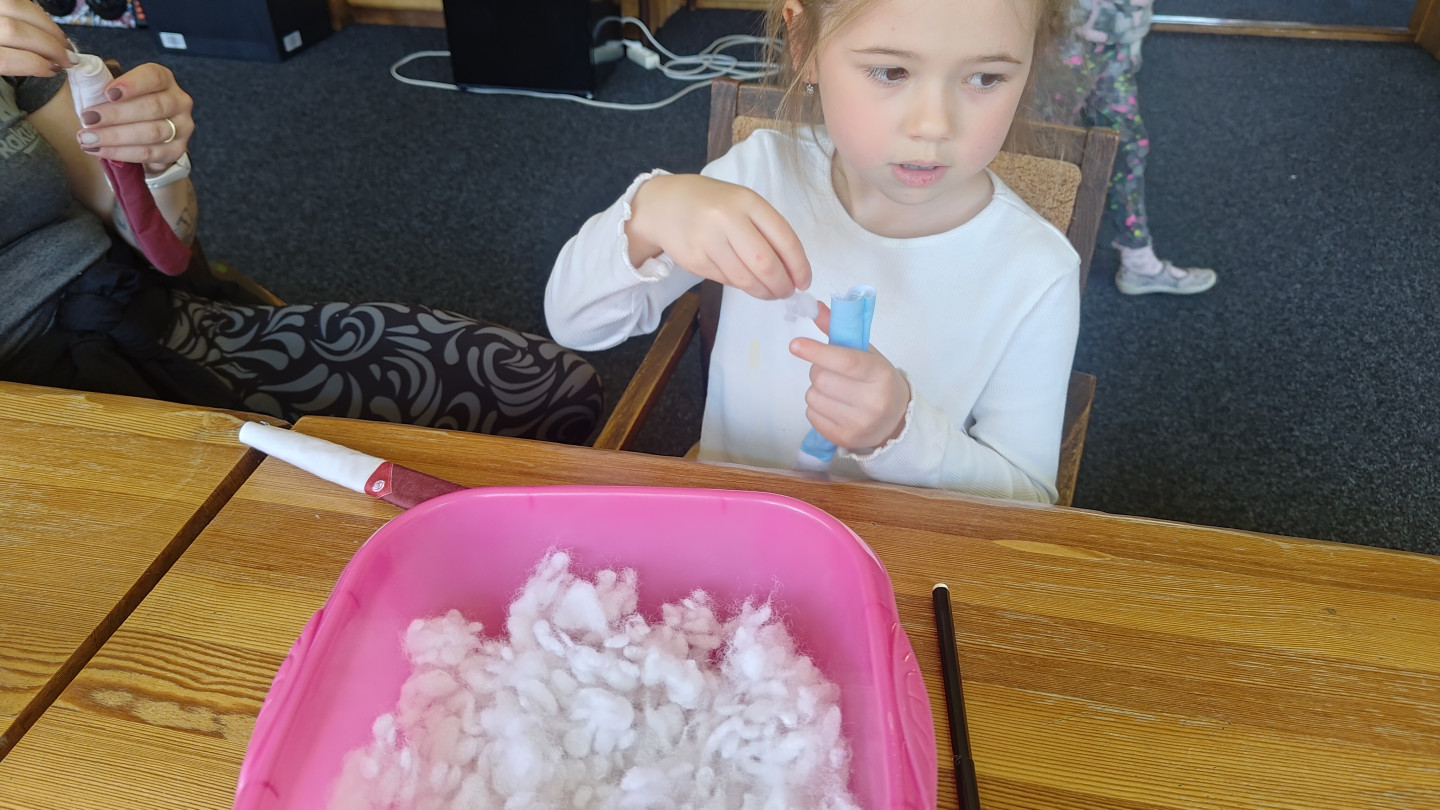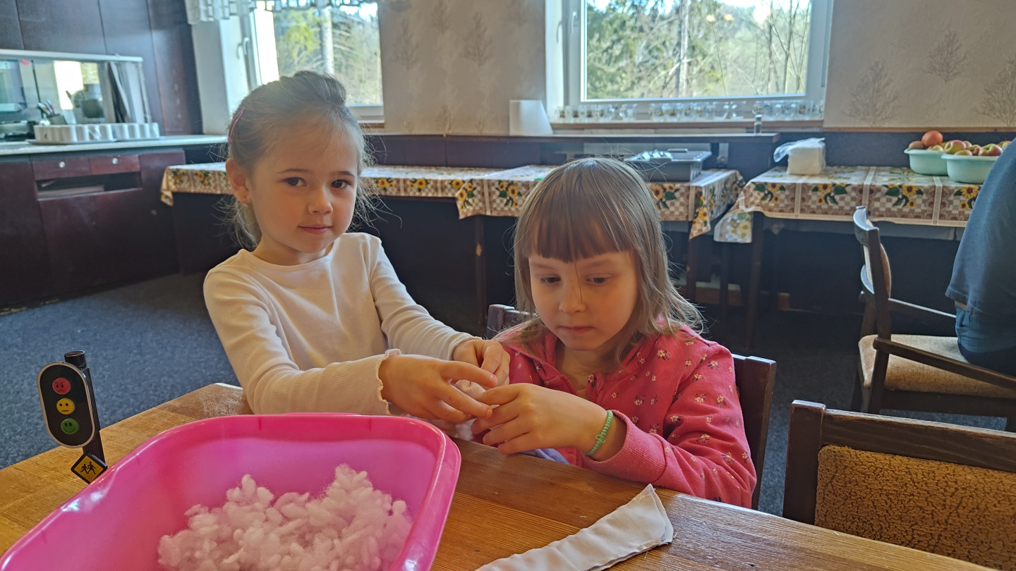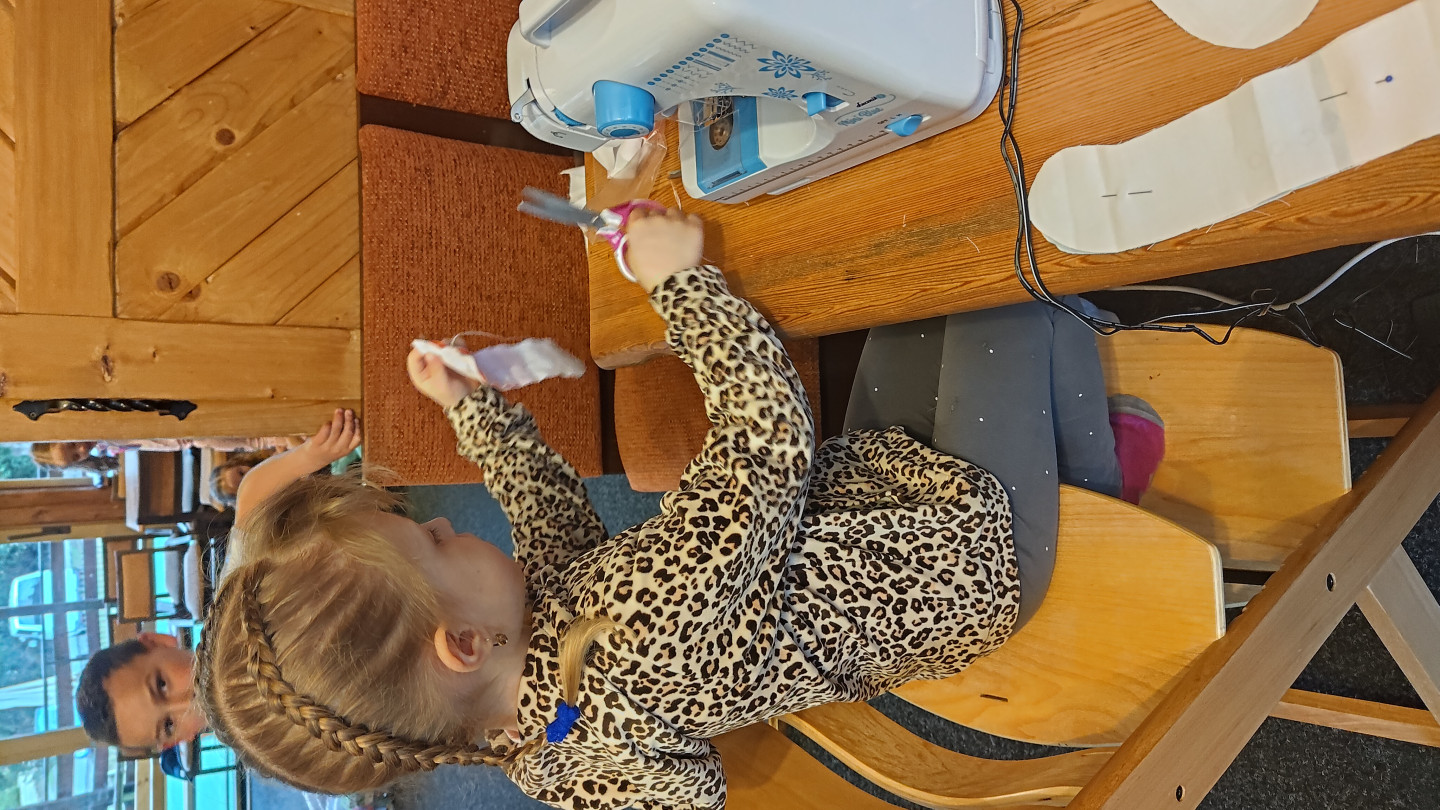Dopoledne si někteří stříhali látku na látkové postavičky, jiní si hráli v herně.